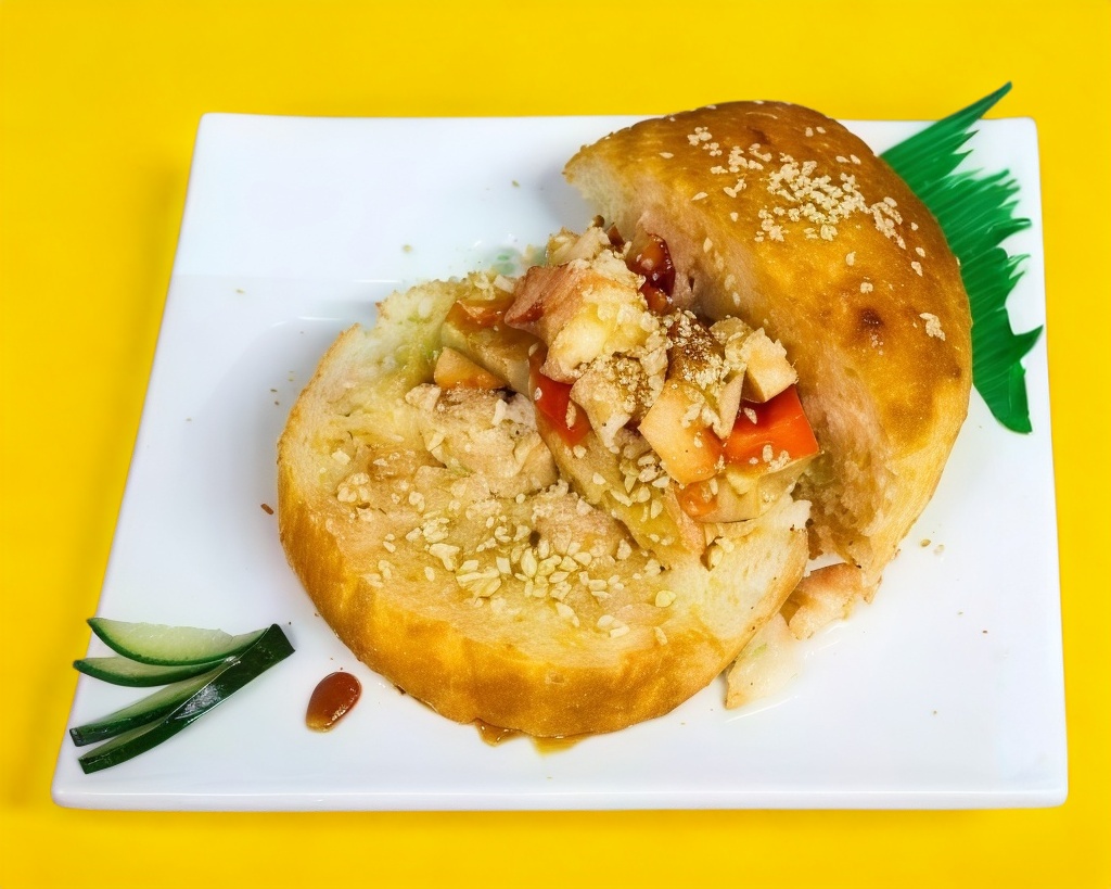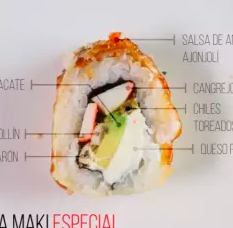 Alga por fuera, queso Philadelphia, aguacate, camarón tempura, cangrejo empanizado, togarashi, tártara, furikake, jengibre, sriracha, bañado en salsa anguila y ajonjolí.