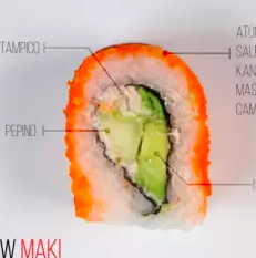 Pepino, aguacate y salmón por dentro. Queso Philadelphia, masago y ajonjolí por fuera.