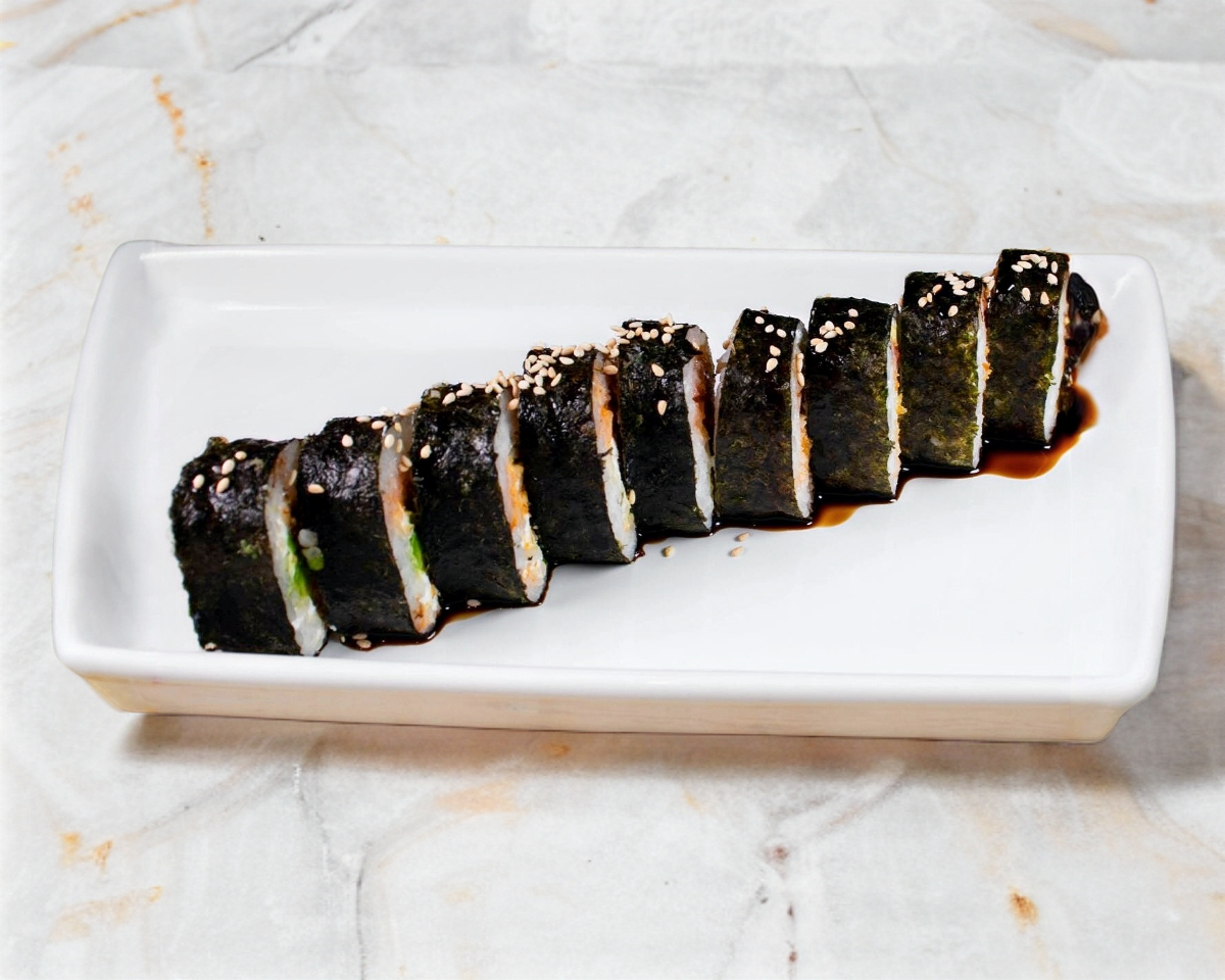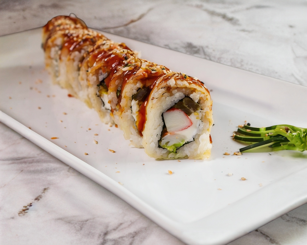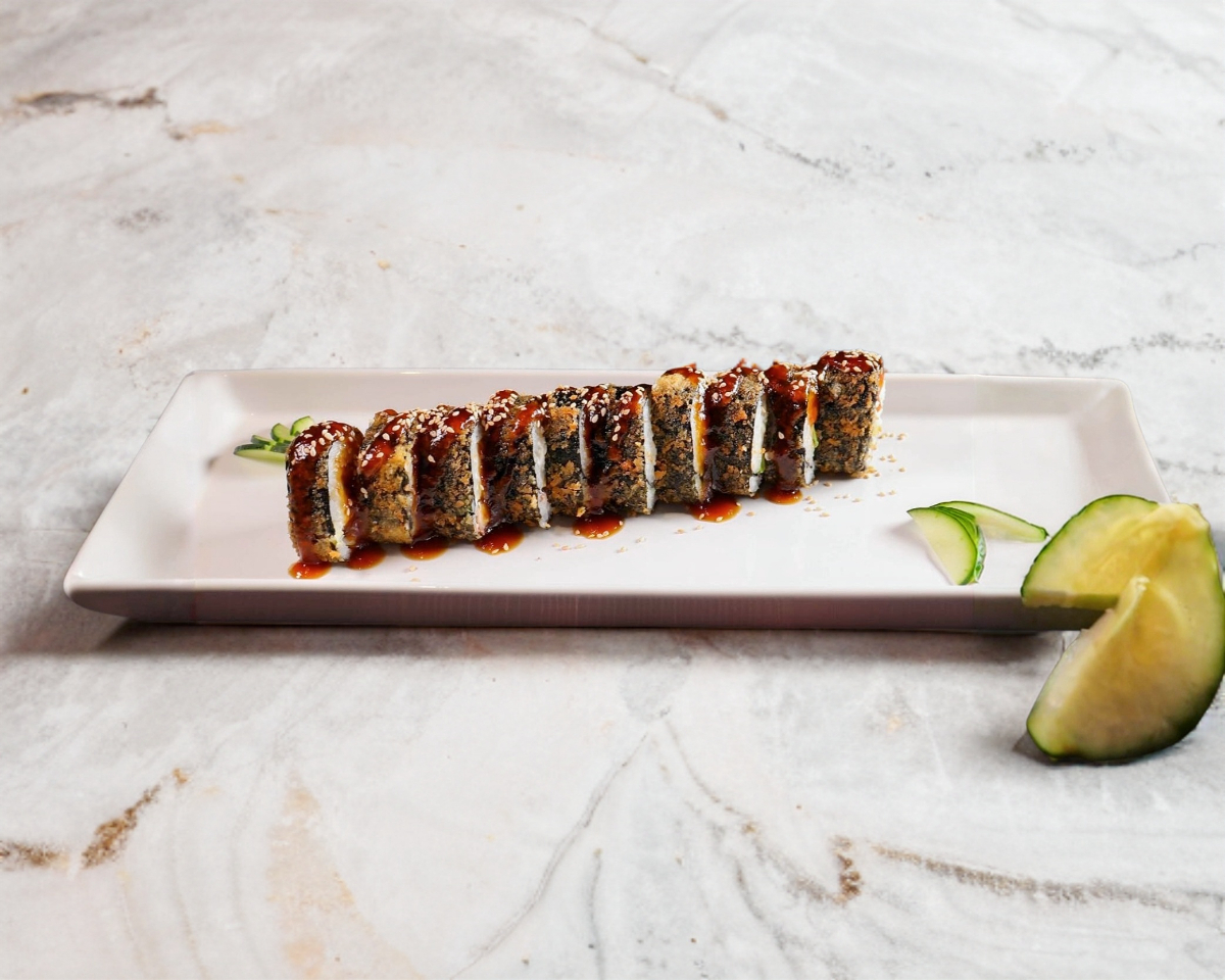 "Alga por fuera, queso Filadelfia, aguacate, camarón tempura, cangrejo empanizado, togarashi, tartara, furikake, jengibre, sriracha bañado en salsa anguila y ajonjoli"
