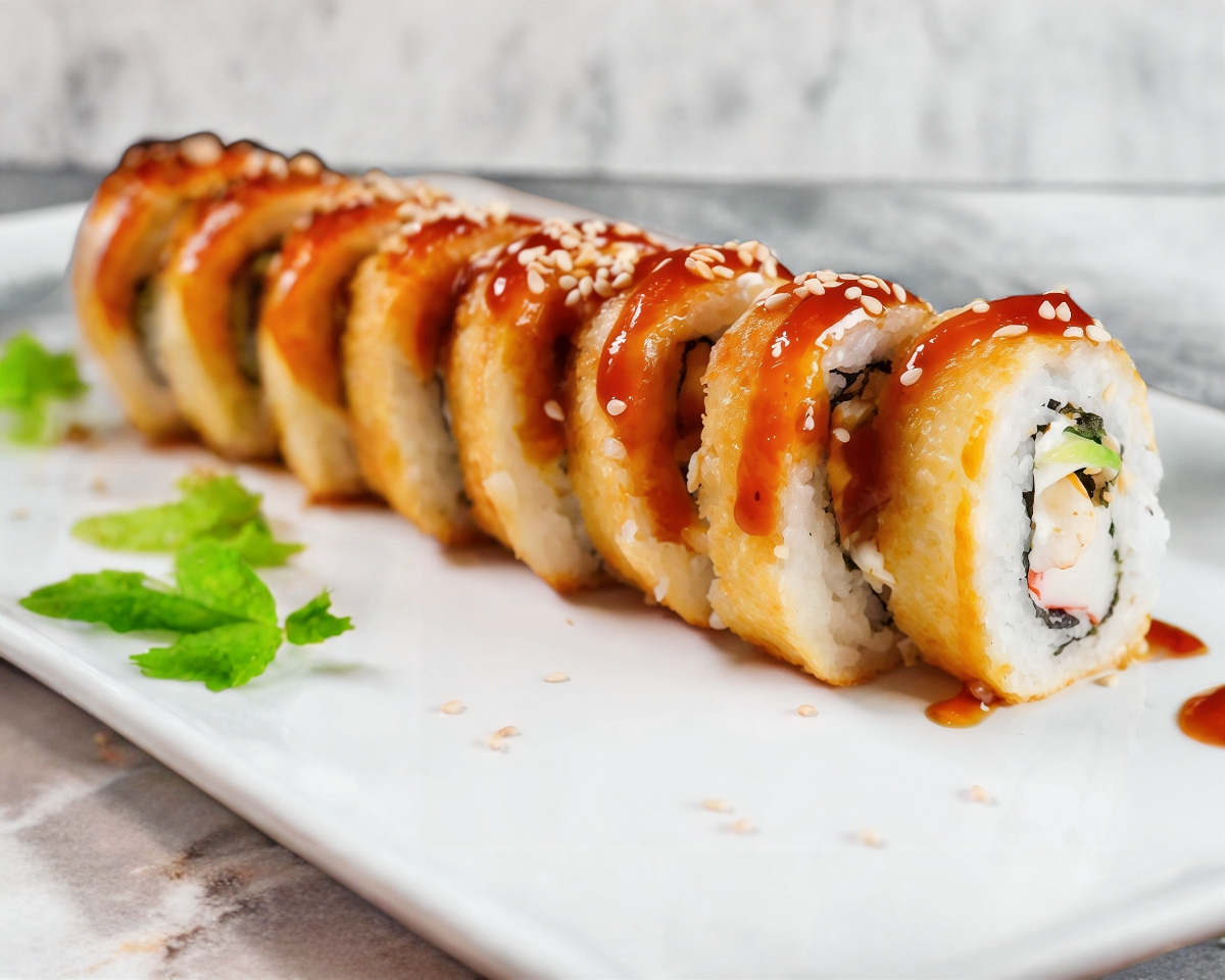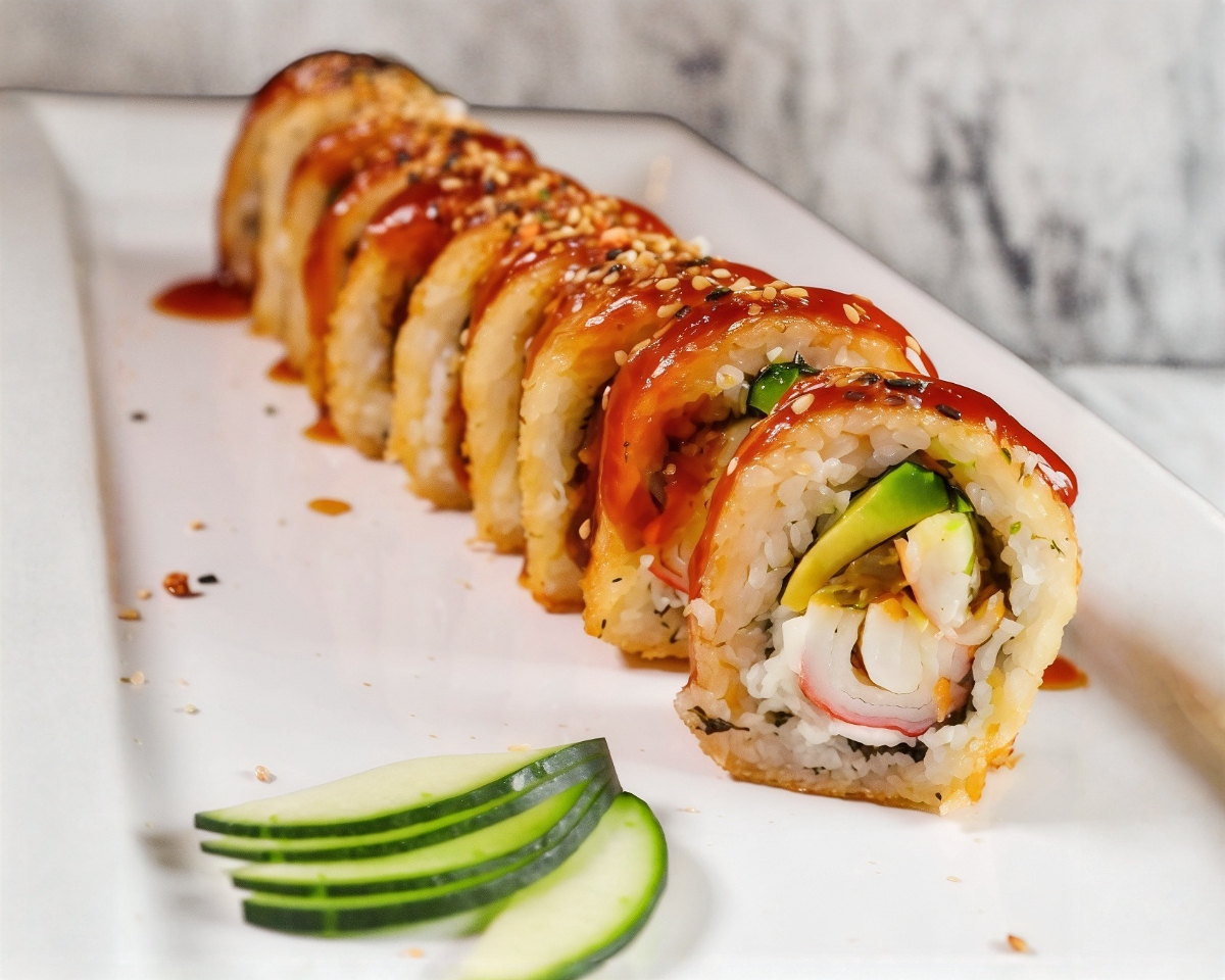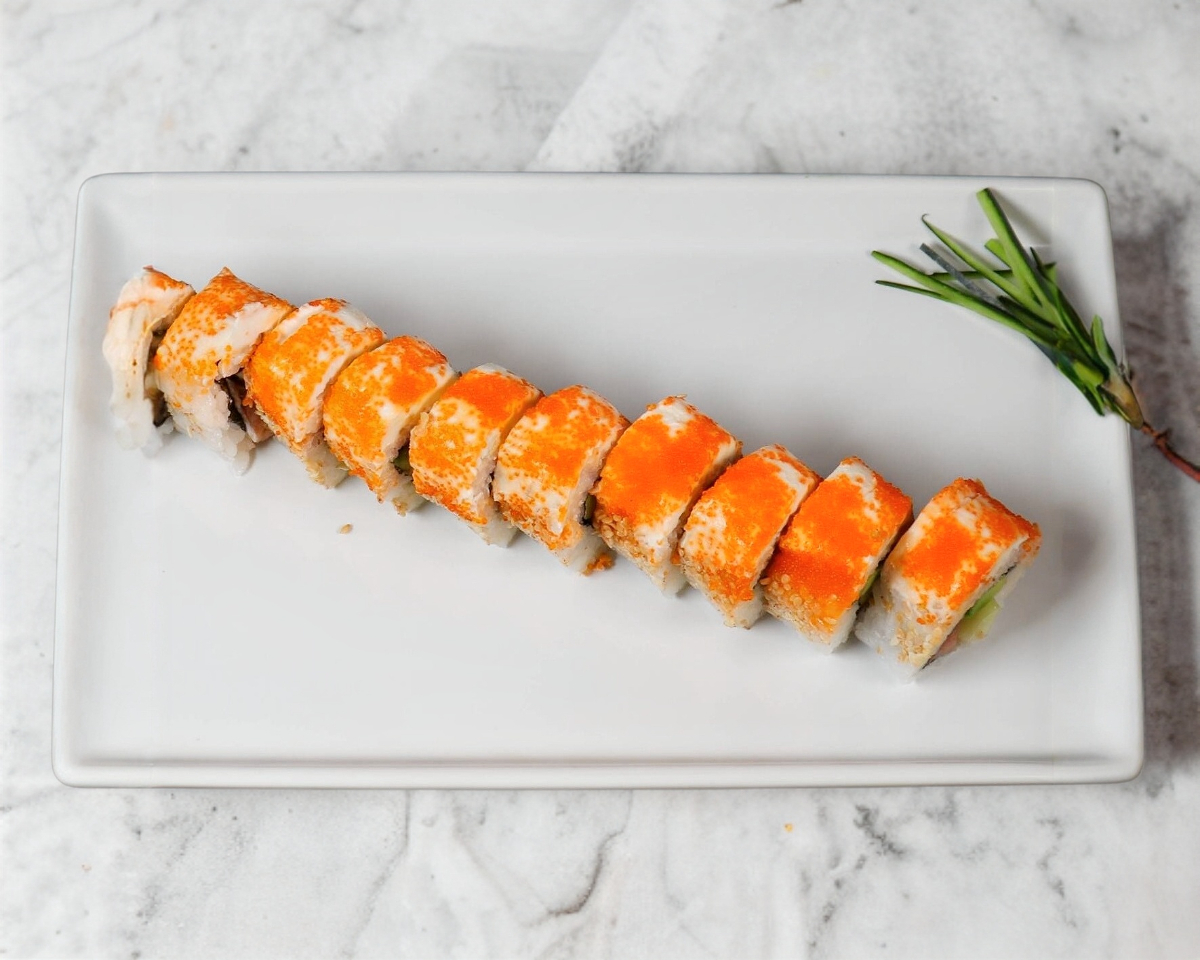 "Alga por fuera, queso Filadelfia, aguacate, camarón tempura, cangrejo empanizado, togarashi, tartara, furikake, jengibre, sriracha bañado en salsa anguila y ajonjoli"
