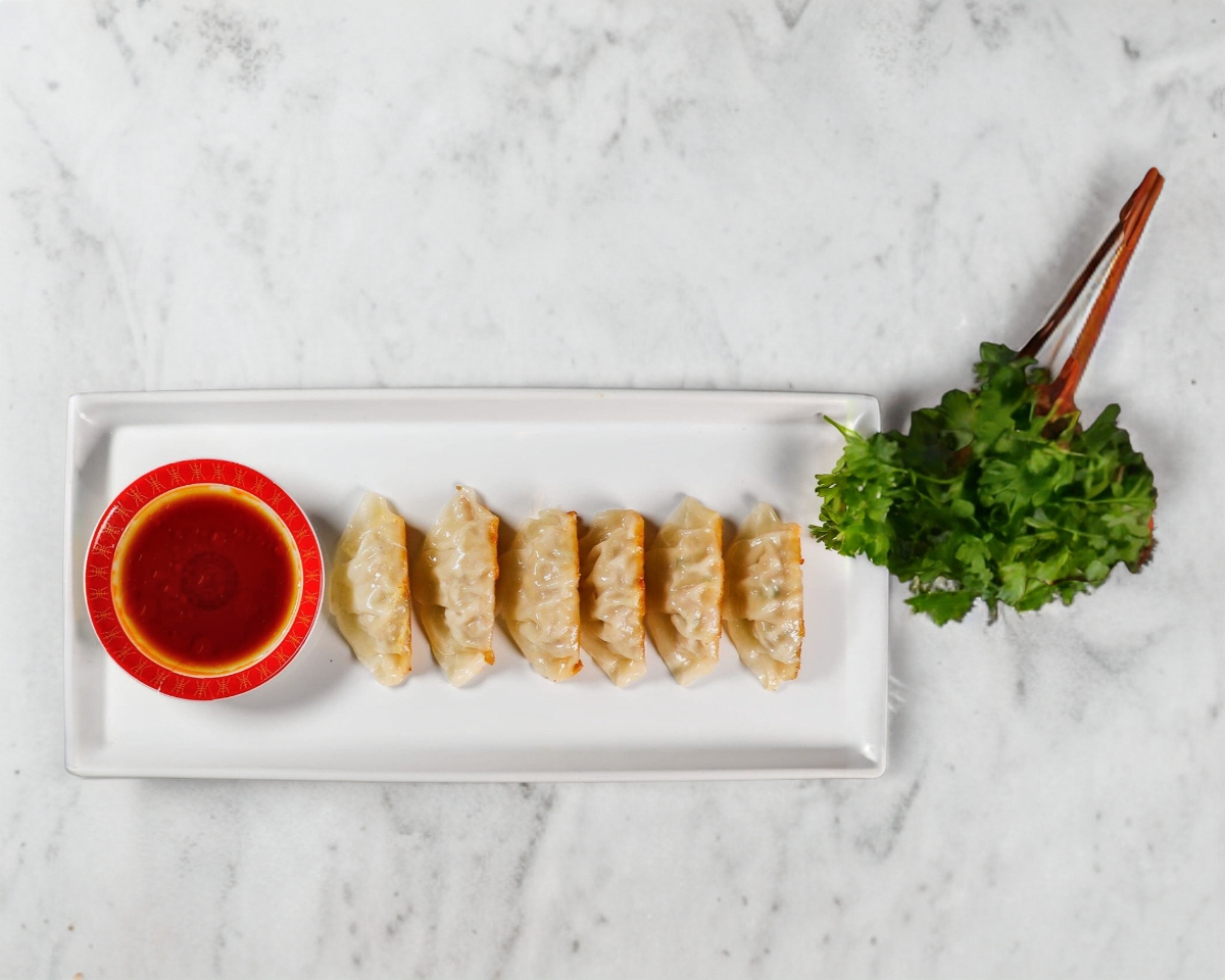 "Empanadas de relleno de carne de cerdo con verduras orientales ( col, jengibre, cebollin, nira, ajo ) acompañados de un rica salsa con la-yu )"
