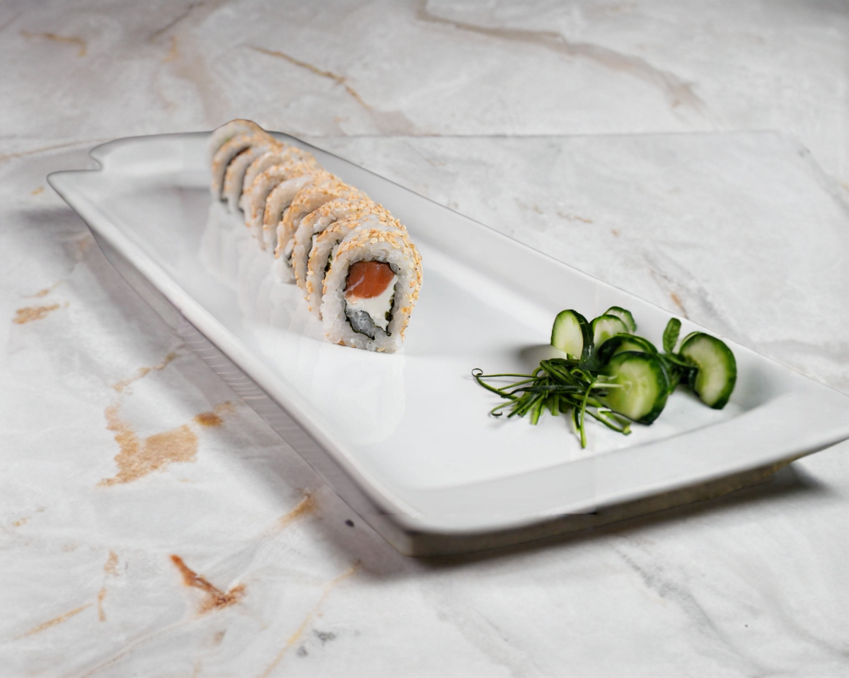 "Pepino, aguacate y salmon por dentro y por fuera queso filadelfia, masago y ajonjoli"