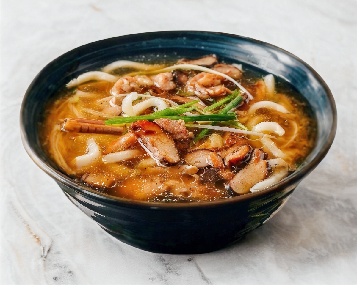 "Fideo grueso japones en rico caldo base japones con kamaboko y veduras"