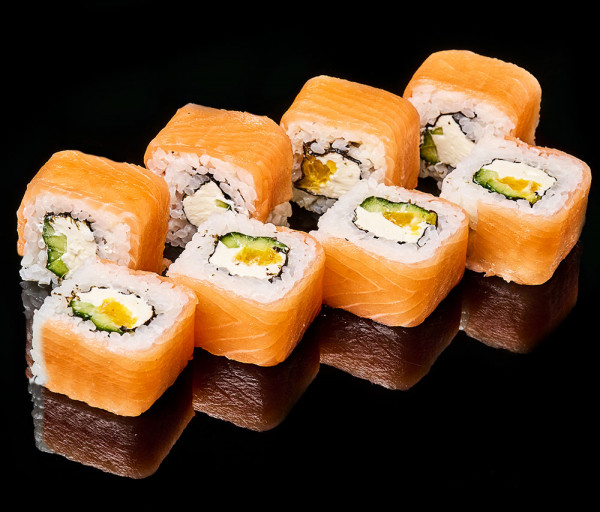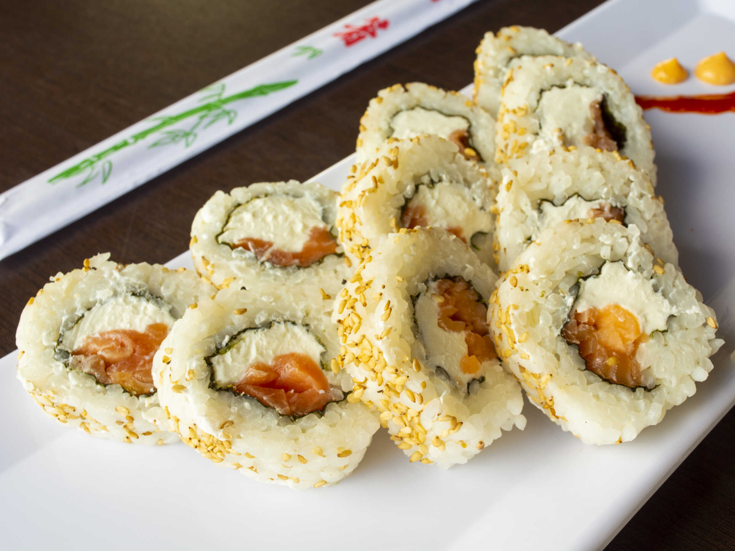 Salmón, queso, cubierto de Masago y ajonjolí tostado.