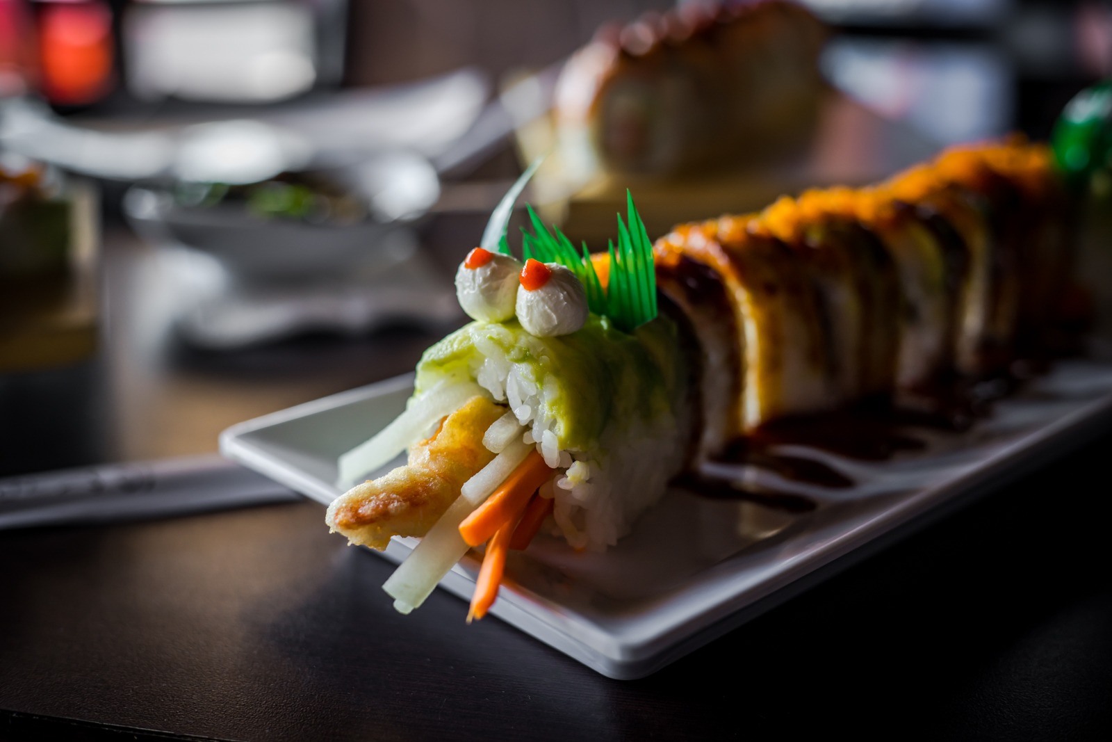 Camarón tempura, pepino, zanahoria, cubierto de aguacate, anguila y masago.