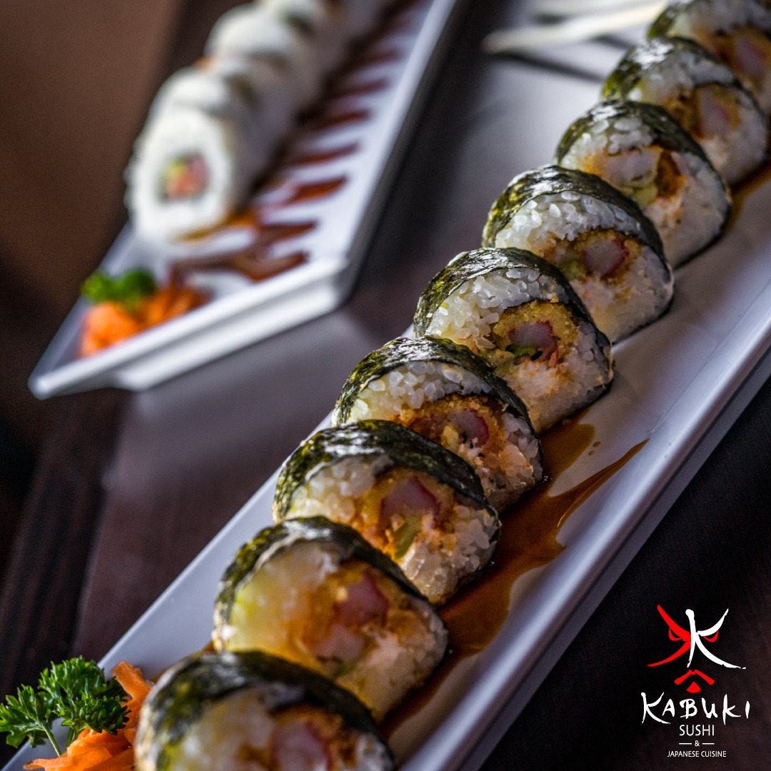 Camarón, filadelfia,y aguacate con cangrejo, tampico y salsa kabuki.