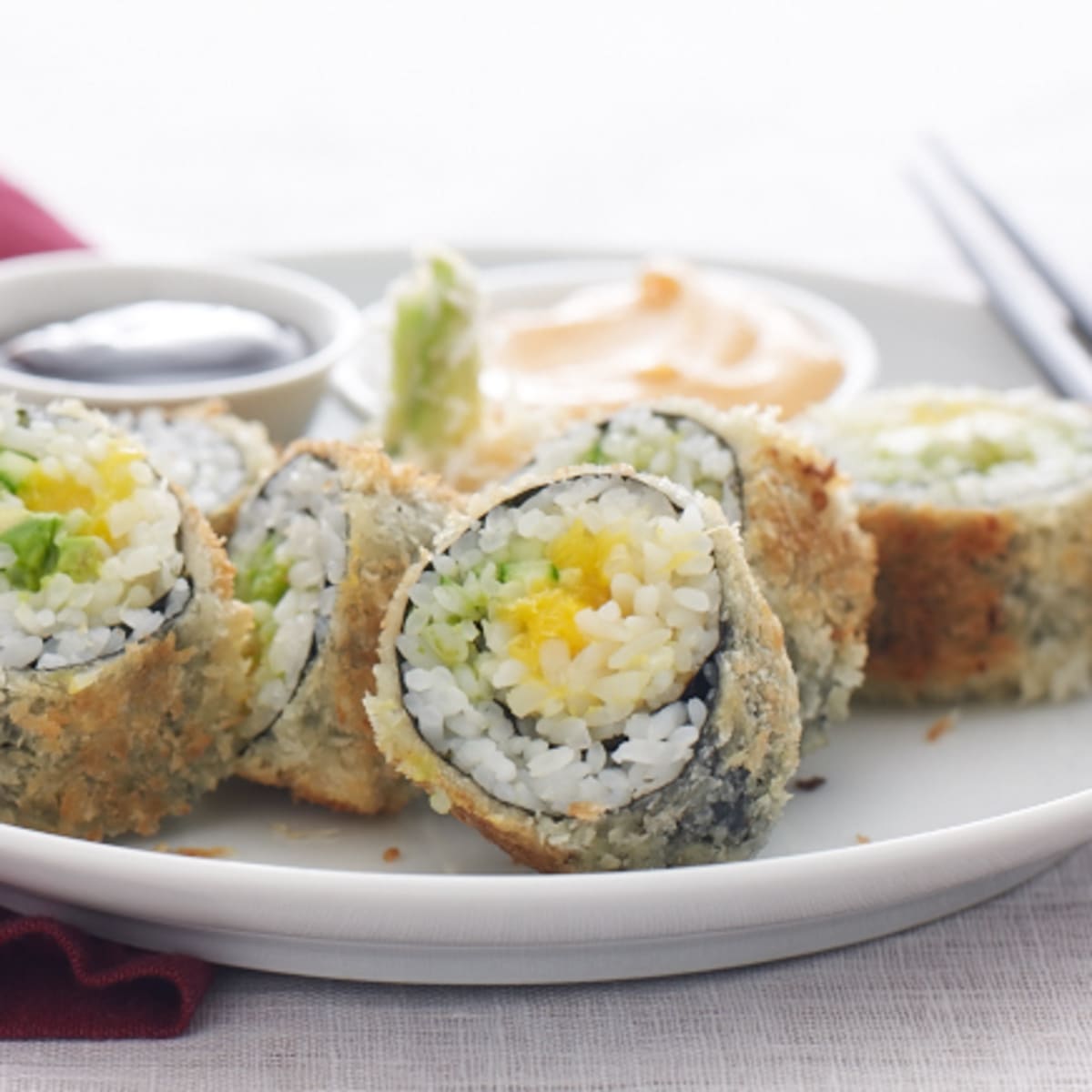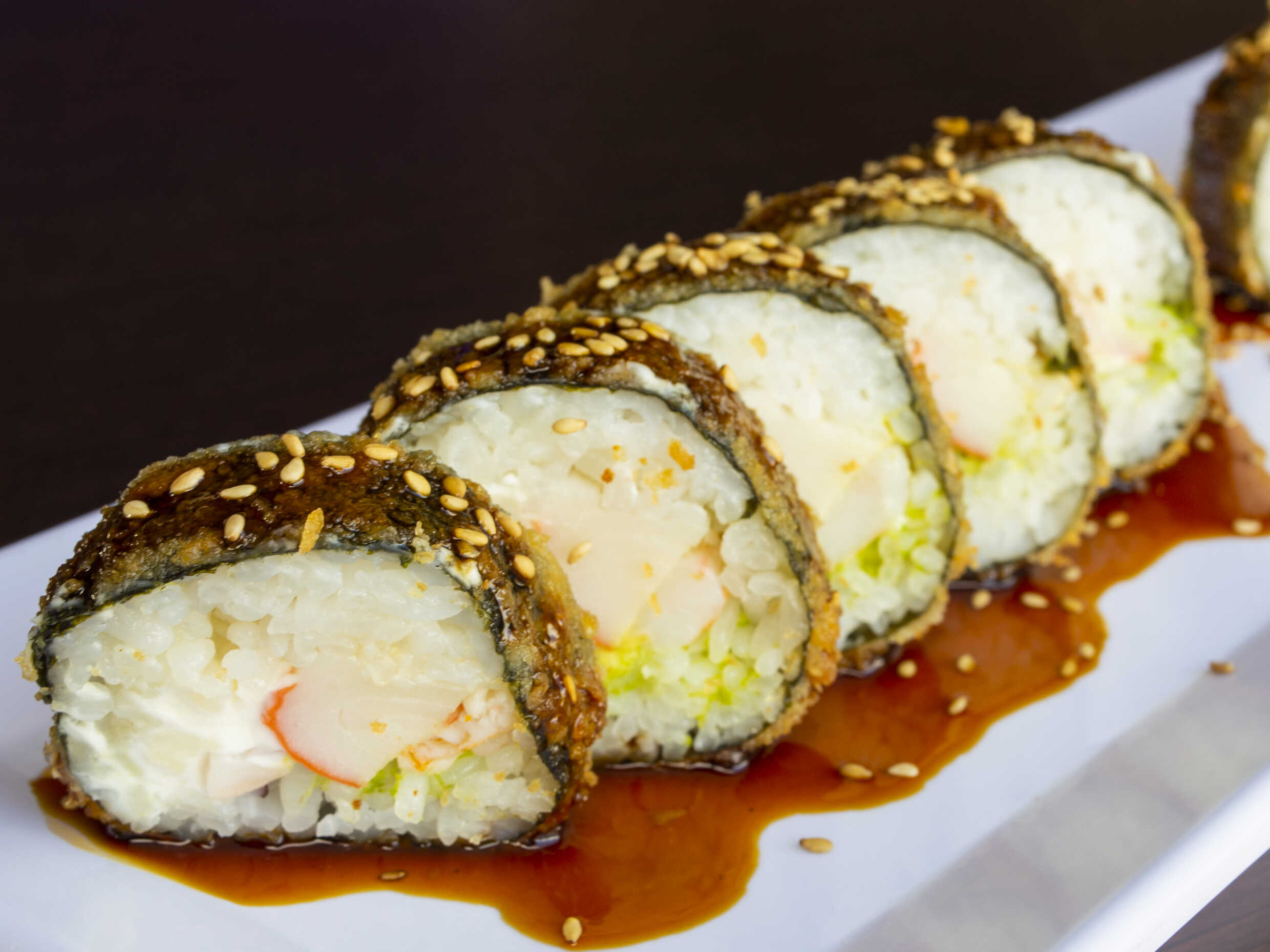 Camarón tempura, cangrejo empanizado, queso aguacate, togarashi y siracha.
