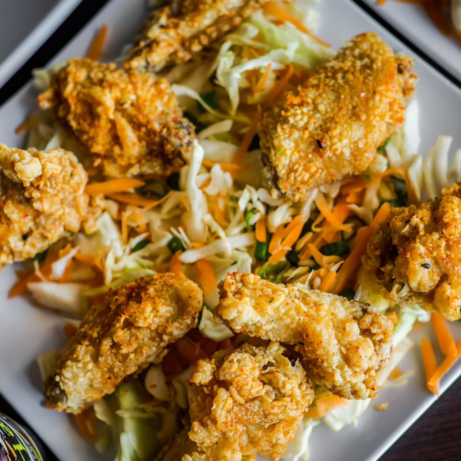 Sarada (capeado) camarón fresco, surimi, aguacate, Philadelphia, cubierto de una huí con una porción de chuka sarada, bañado en salsa de anguila