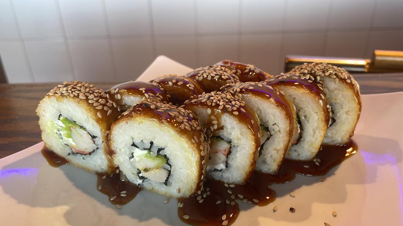 Camarón tempura, queso, aguacate, cangrejo, bañado en salsa de coco.