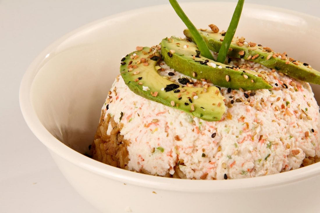 Arroz blanco, cangrejo, aguacate, furikake, katsuito y cebollín.