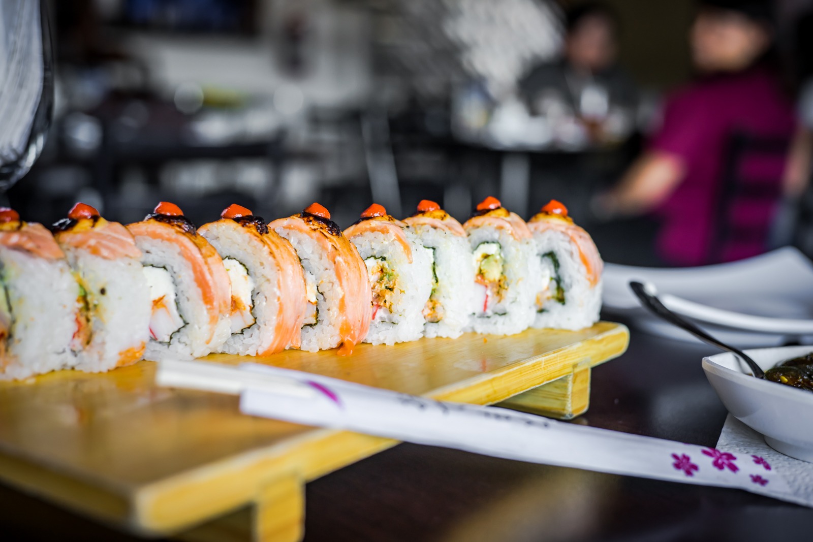 Salmón, anguila, cangrejo, camarón, queso, aguacate, cebollín, chiles toreados y chile japonés.