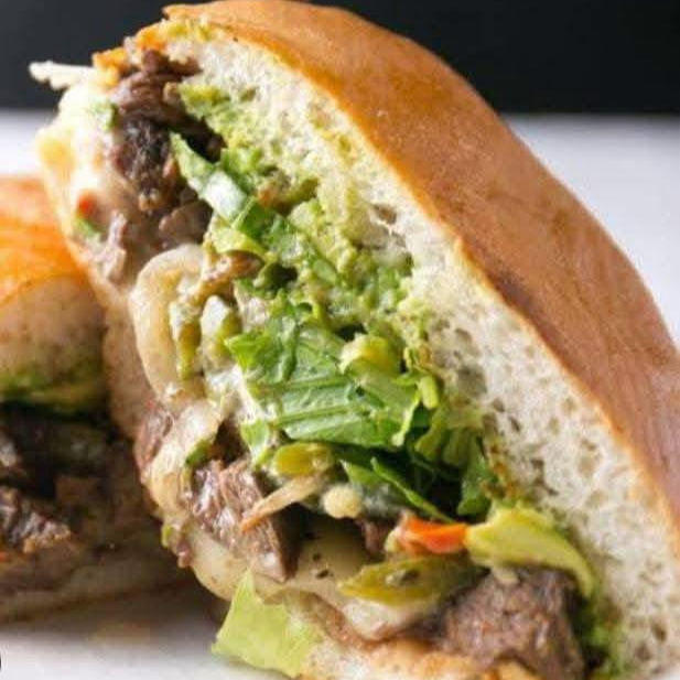 pan grande,bistec a la mexicana, salchicha para azar complementado con salchichon jamon,lechuga,aguacate y mayonesa.