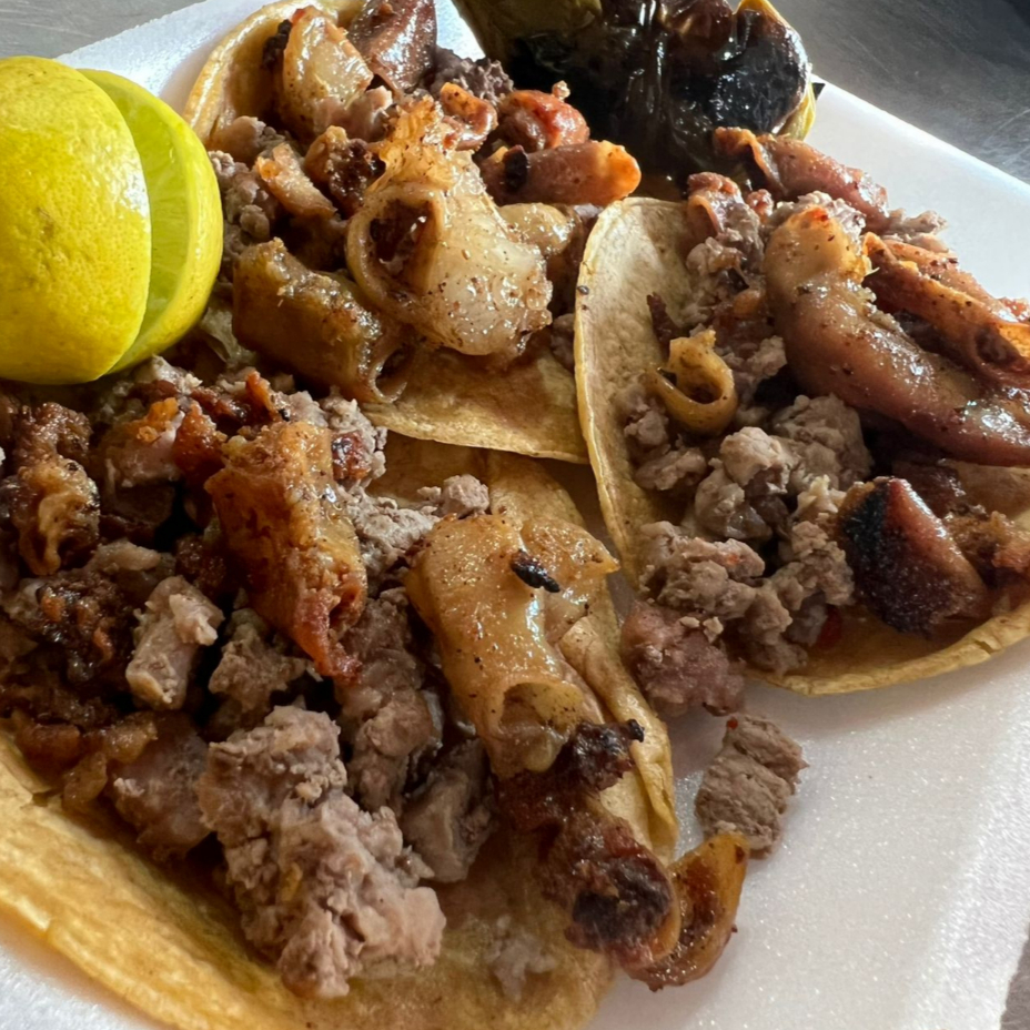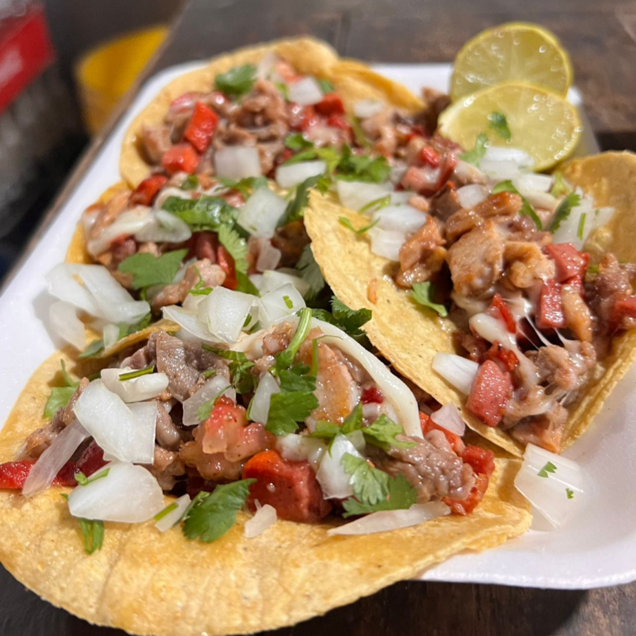 orden de 4 tacos (bistec,puerco,salchicha para azar y queso)