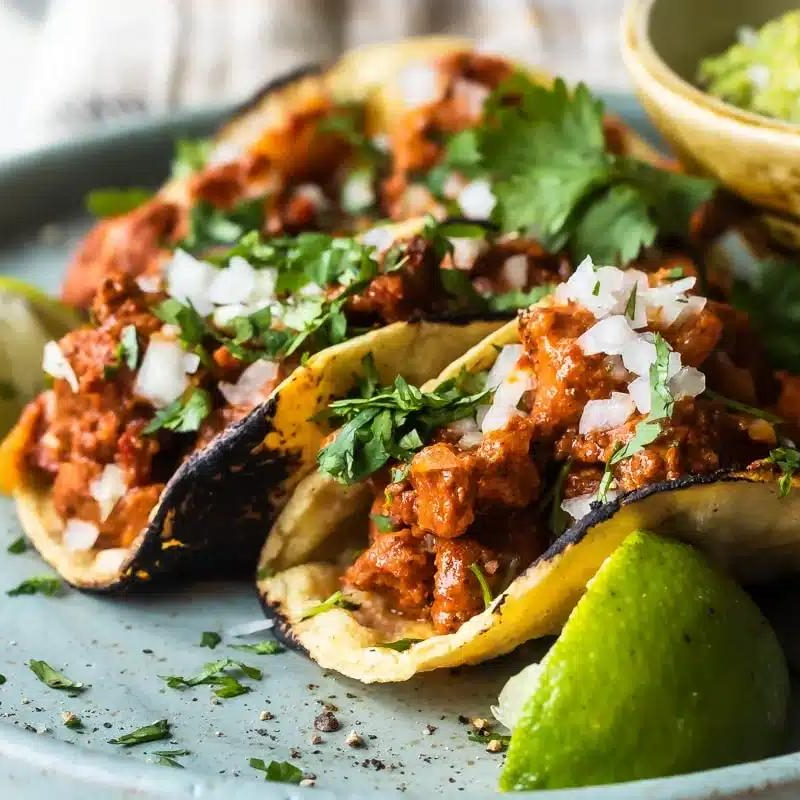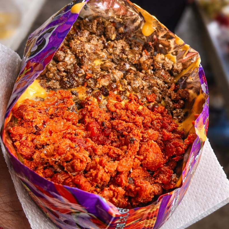 tostitos acompañado con bistec y pastor complementado con queso amarillo,repollo y guacamole.