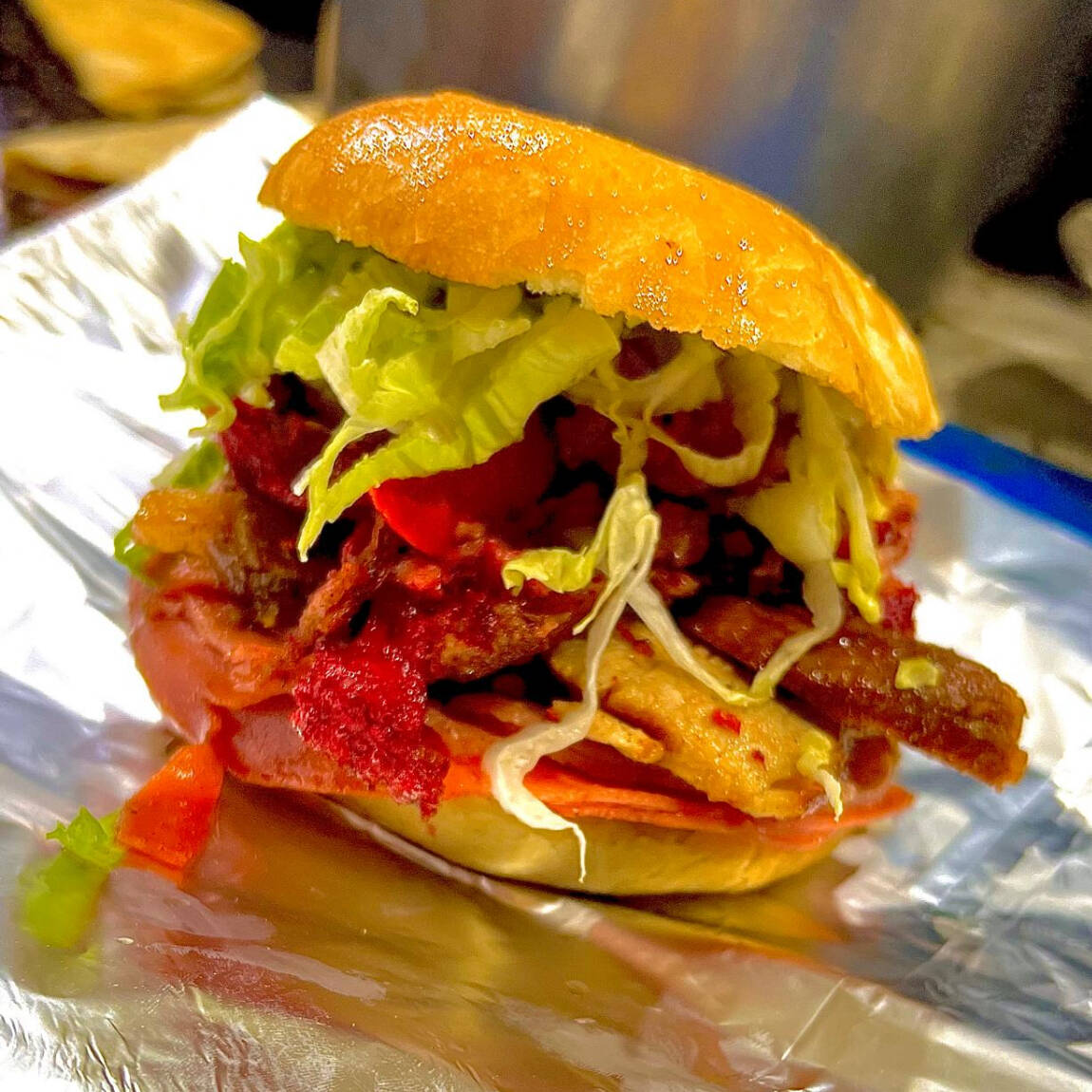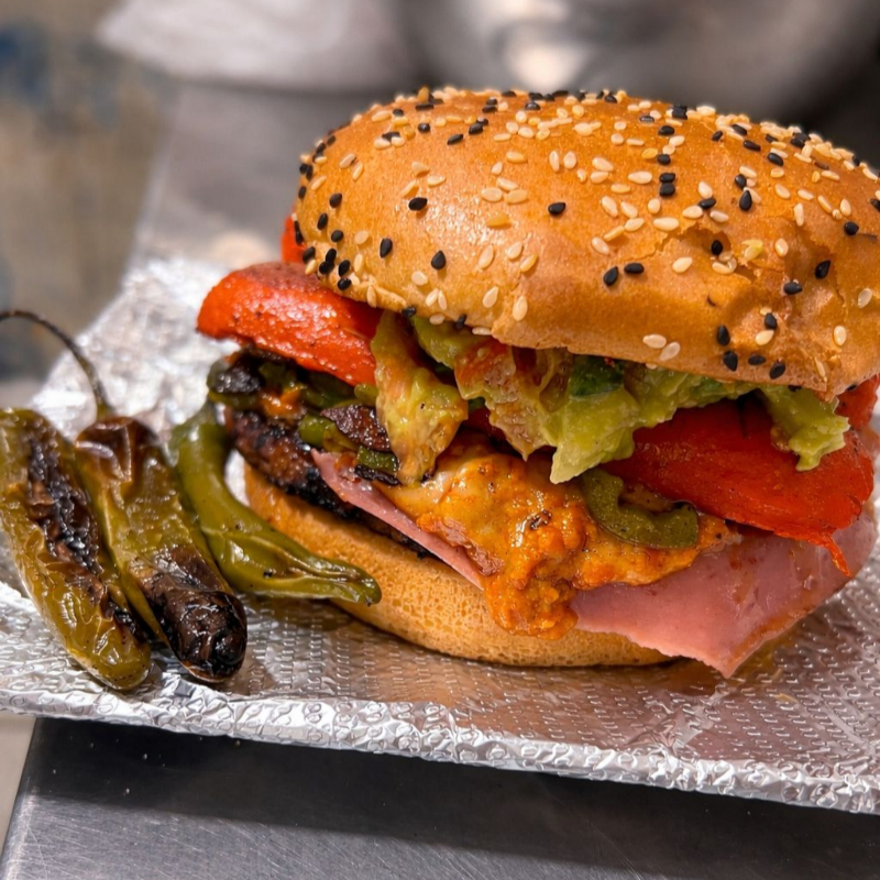 dos carnes de sirloin al carbon complementado con doble jamon,doble queso amarillo, 1 salchicha para asar,doble tocino,queso manchego,lechuga,aguacate,mayonesa y catsup.