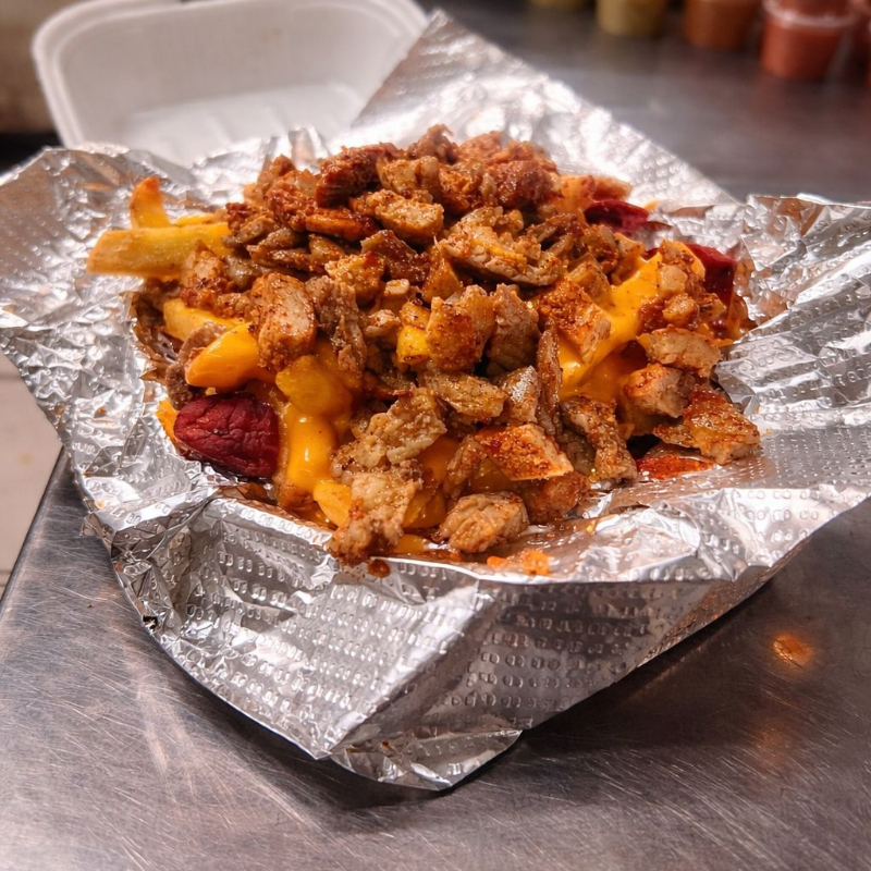 papas fritas acompañadas con queso amarillo,salchicha para asar y bistec.