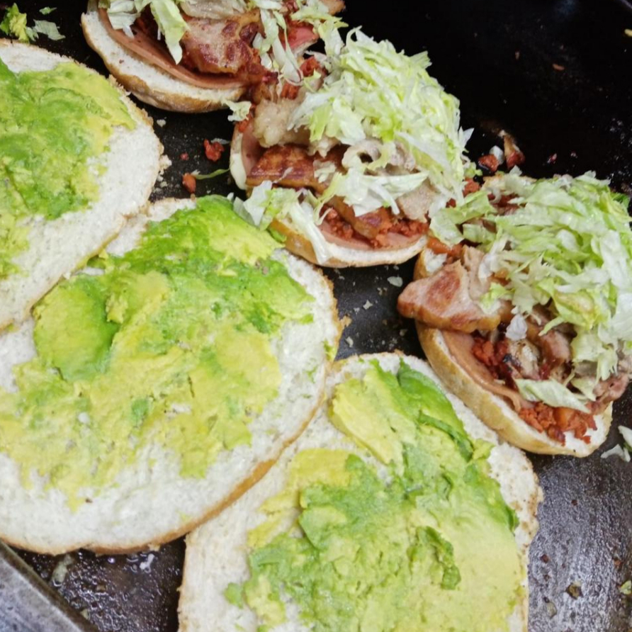 carne al pastor complementada con jamon,salchichon,salchicha para asar,aguacate,lechuga y mayonesa.