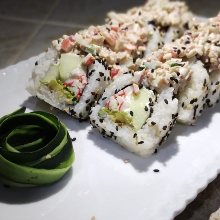 Rollo frio, bañado en ajonjoli. Por dentro surimi, queso crema, pepino y aguacate