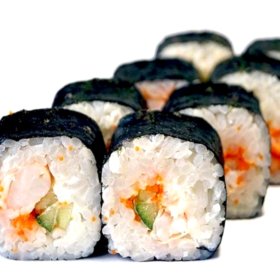 Rollo frio bañado en ajonjoli. Por dentro camarón, aguacate y queso crema.