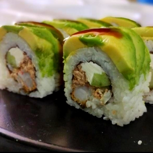 Rollo frio, cubierto de aguacate. Por dentro Salmon, queso crema, siracha.