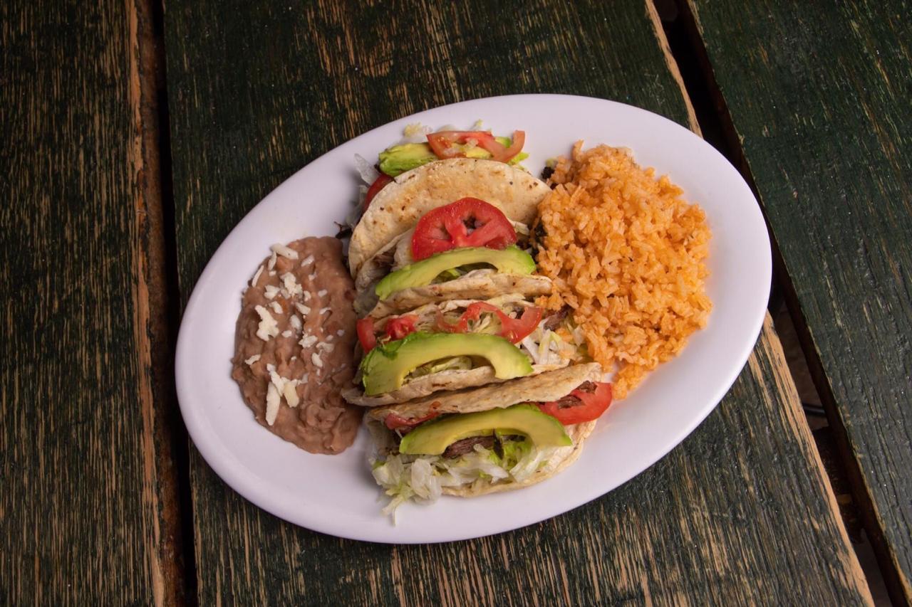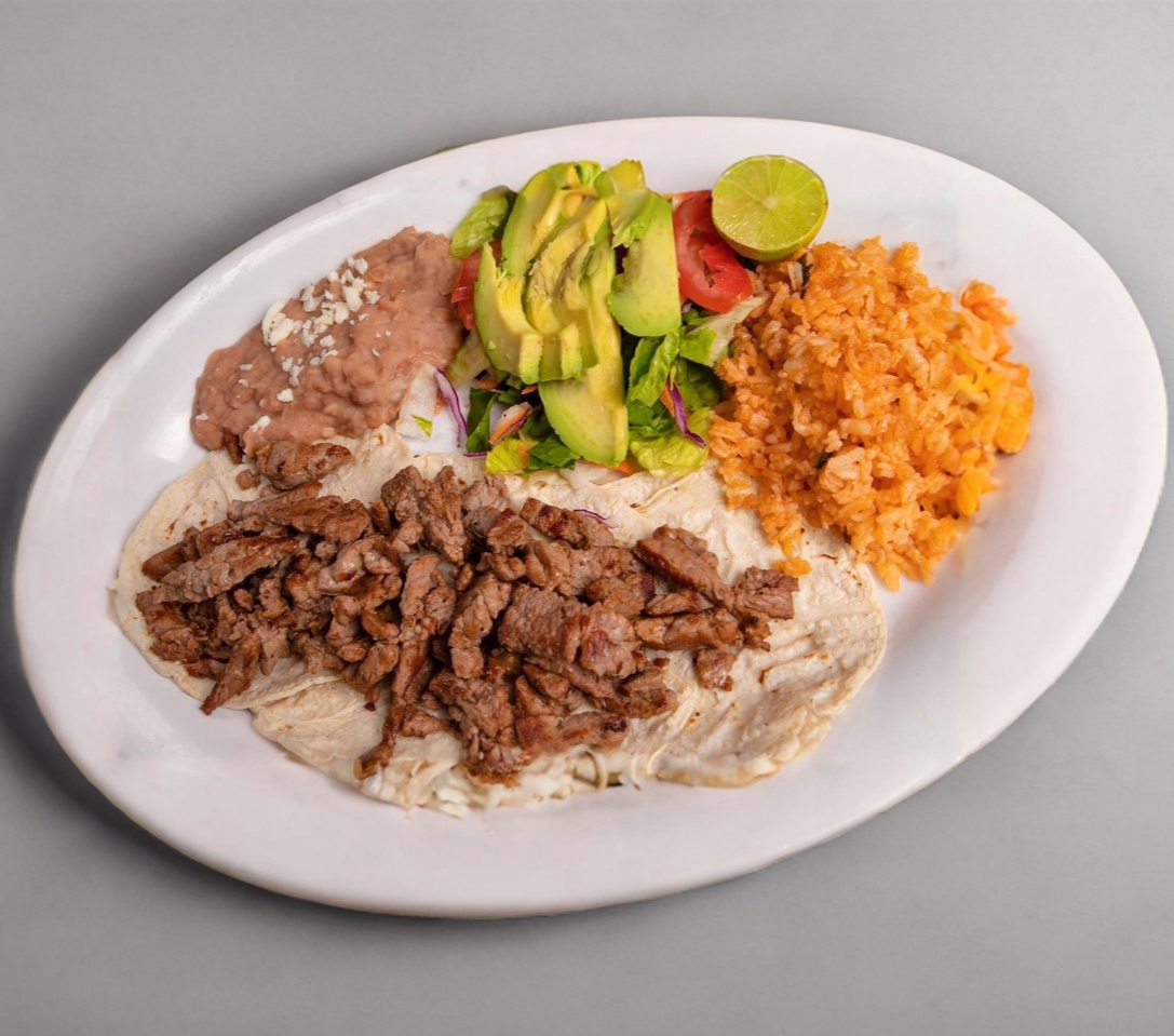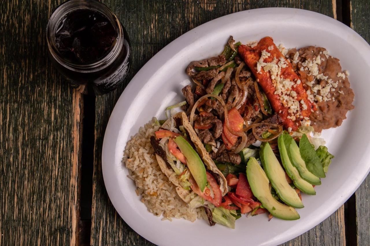 Fajitas de pechuga o sirloin guisadas con cebolla y morrón, acompañado por una enchilada roja, un taco dorado, arroz y frijoles.