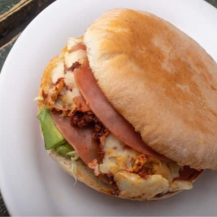 Ricos molletes montados con chorizo, tocino ó jamón, o sencillos, acompañados con papas.