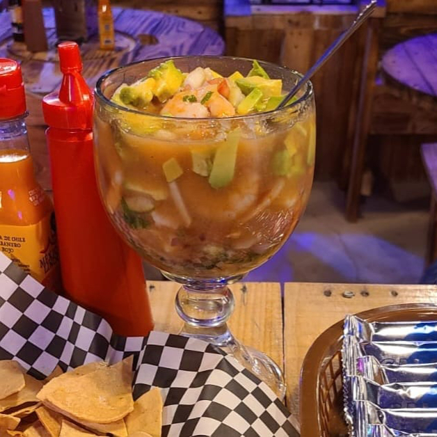 Este es una Chavela de. Coctel de camarón sus deliciosos ingredientes. Que conlleva este delicioso manjar de mariscos so salsa coctelera, camarón mediano, tomate, pepino, cilantro y cebolla, acompañadas de unas galletas saladas