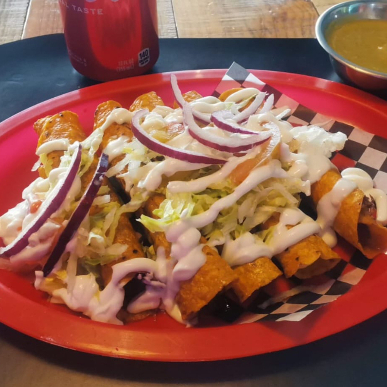 Orden de flauta de 5 flautas acompañadas de su verdura con una deliciosa porción de lechuga tomate cebolla morada, acompañada con una deliciosa salsa picante que deleitará tu paladar.