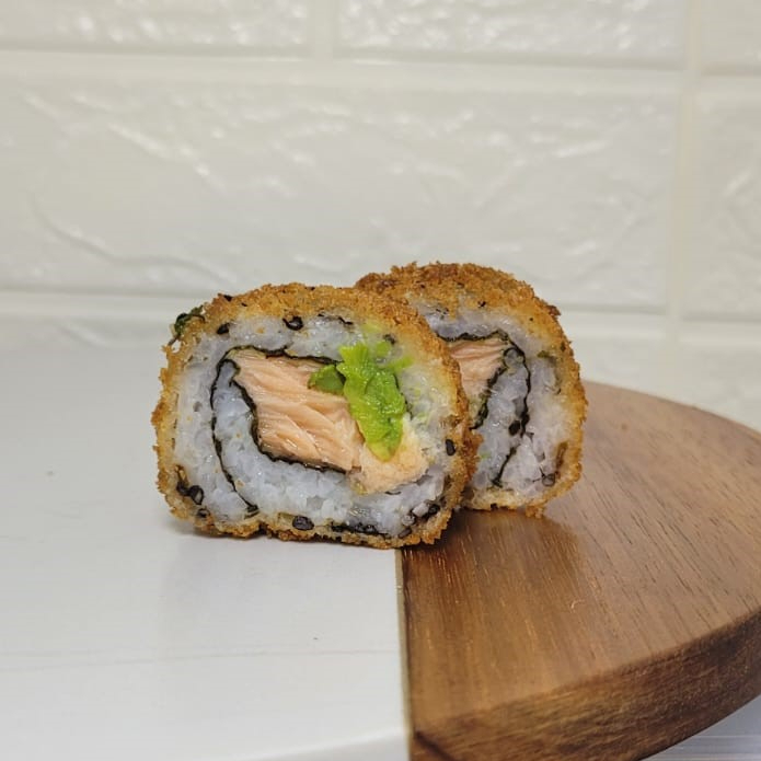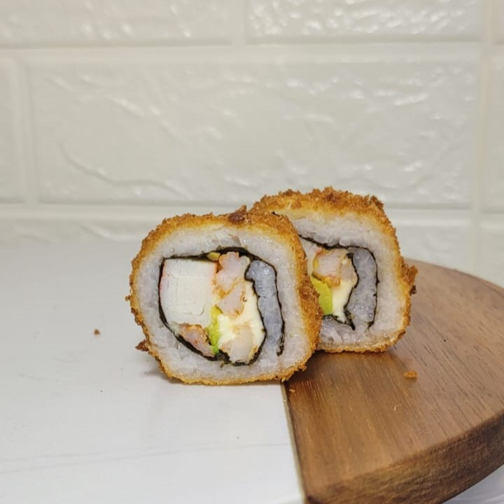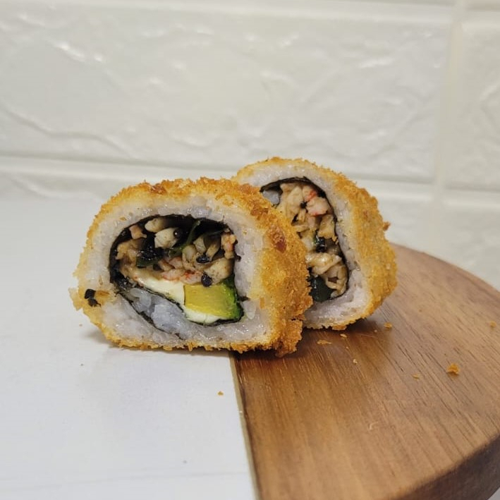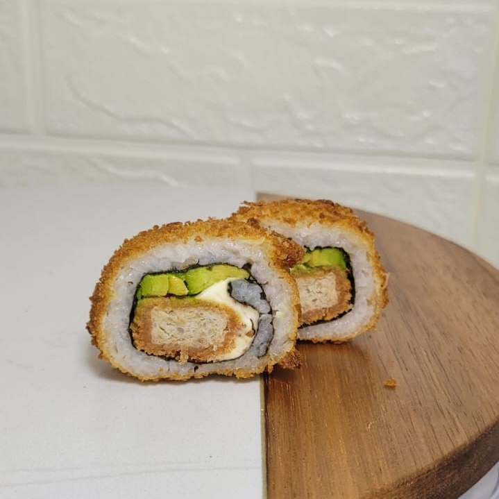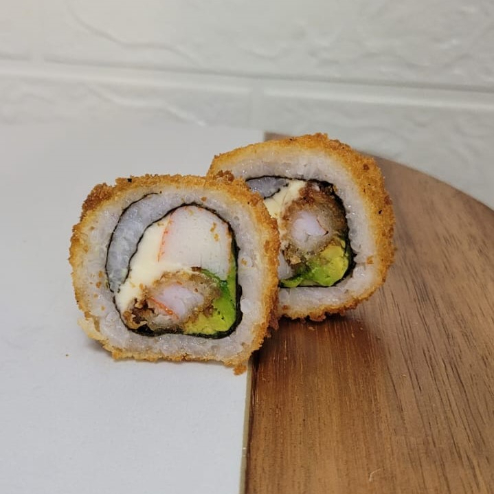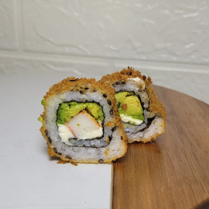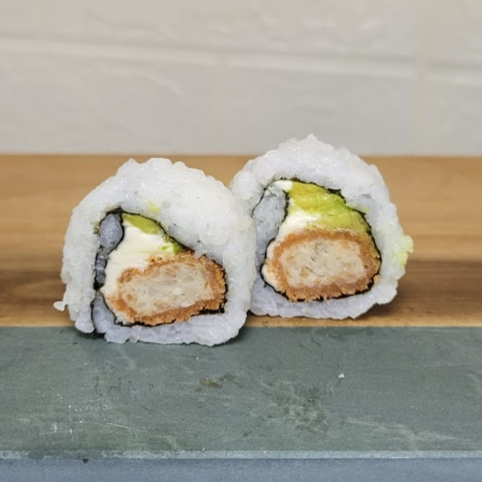 Rollo relleno de pescado empanizado, queso crema y aguacate