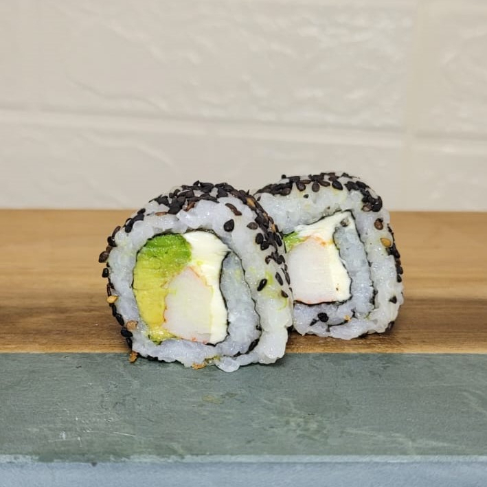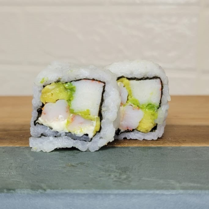Rollo relleno de camarón, queso crema, surimi y aguacate