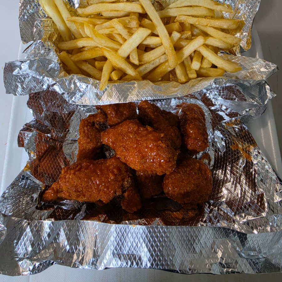 8 Piezas de Boneless bañados en la salsa de tu elección, acompañadas de papas fritas