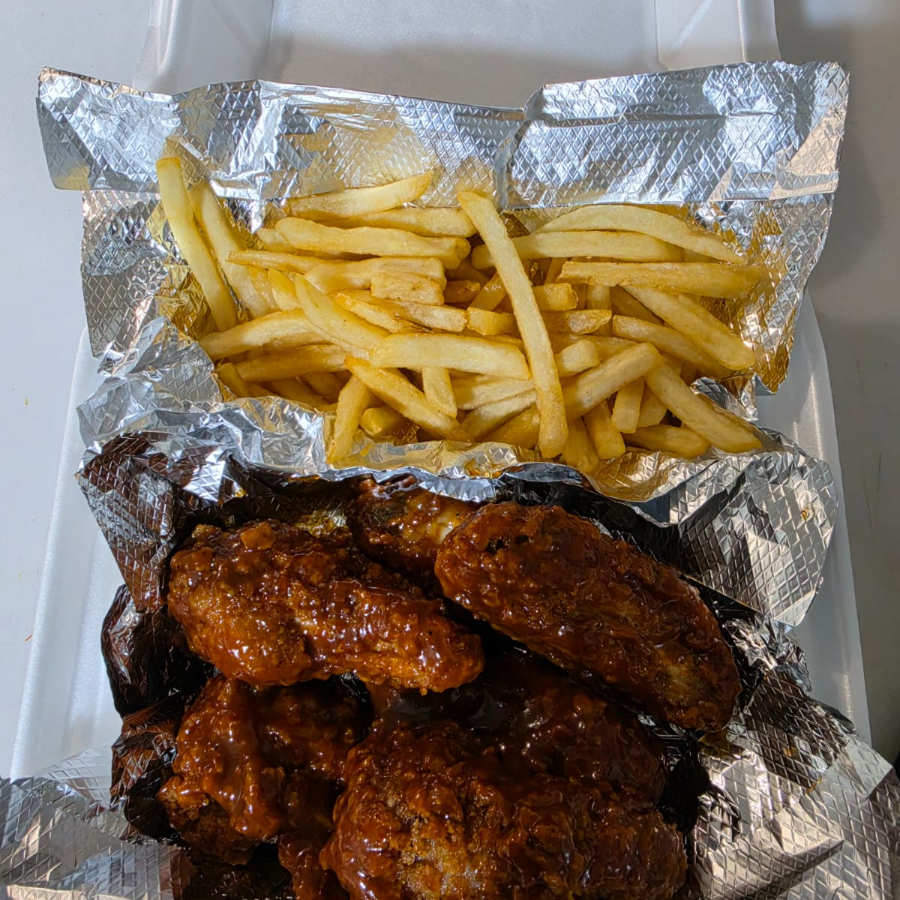10 Piezas de Alitas bañadas en la salsa de tu elección, acompañadas de papas fritas