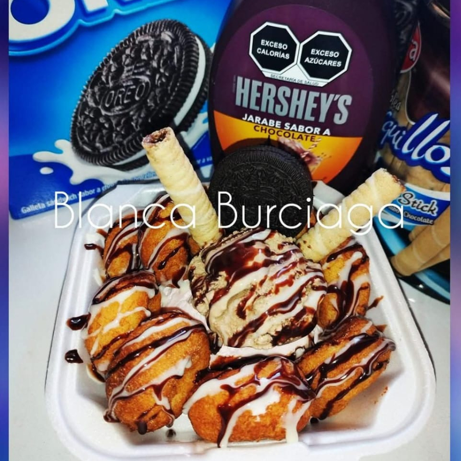 CHAROLA CON 12 DONITAS CON CHOCOLATE HERSHEYS Y NIEVE DEL SABOR DE TU PREFERENCIA