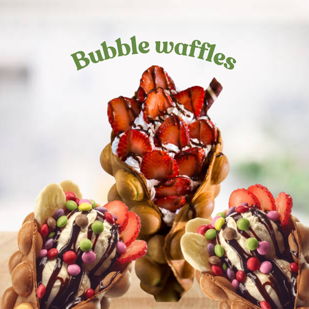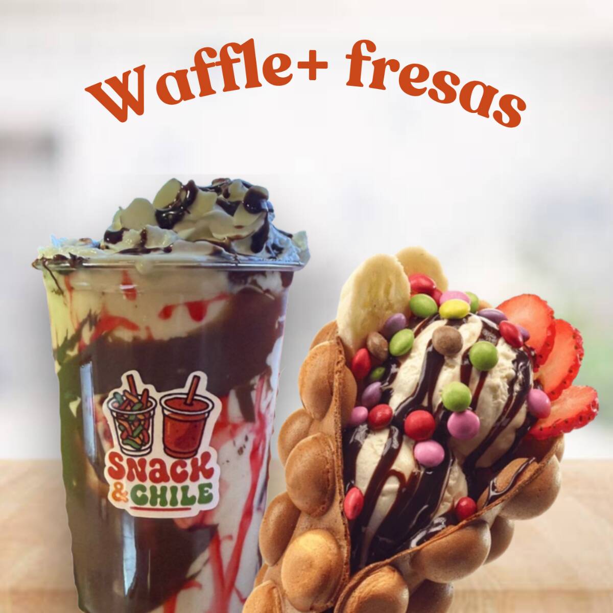 Waffle burbuja calientito y esponjoso, servido con toppings a elegir como frutas de temporada, crema batida, chocolate, jarabe de fresa, lechera y ,miel. ¡Dulce, crujiente y perfecto para consentirte al estilo Snack & Chile!