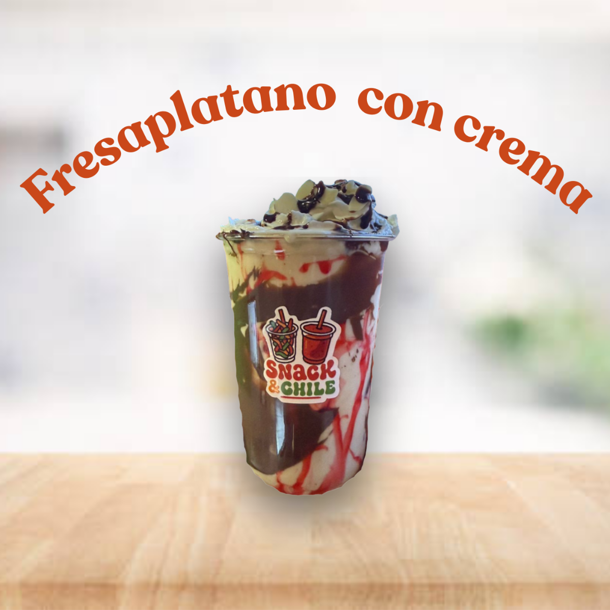 Fresas con platano bañados con nuestra crema especial, con nutella en el vaso y deliciosa crema batida.