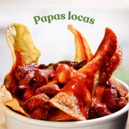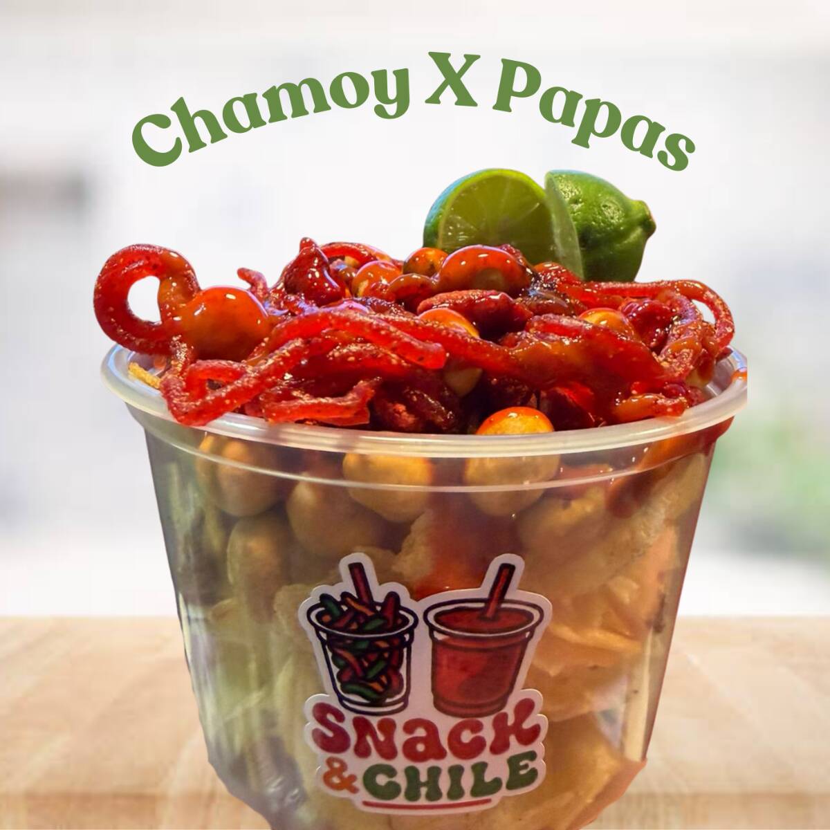 Crujientes papas preparadas al momento con chamoy, cacahuates. ¡La combinación perfecta de dulce, salado y picosito que te encantará!