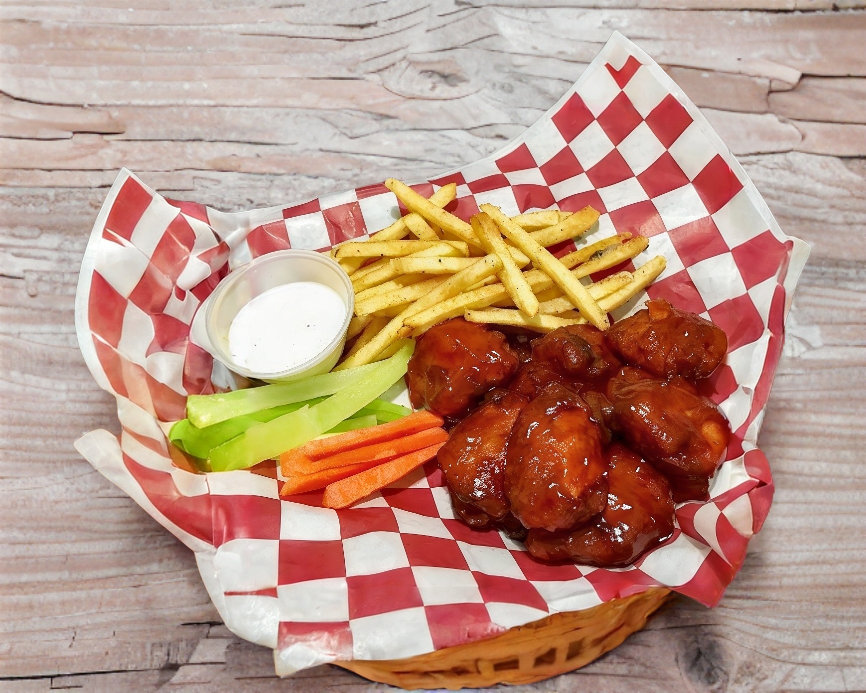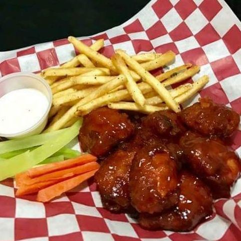 Acompañado con papas fritas bastones,apio,zanhoria,ranch,ketshup.