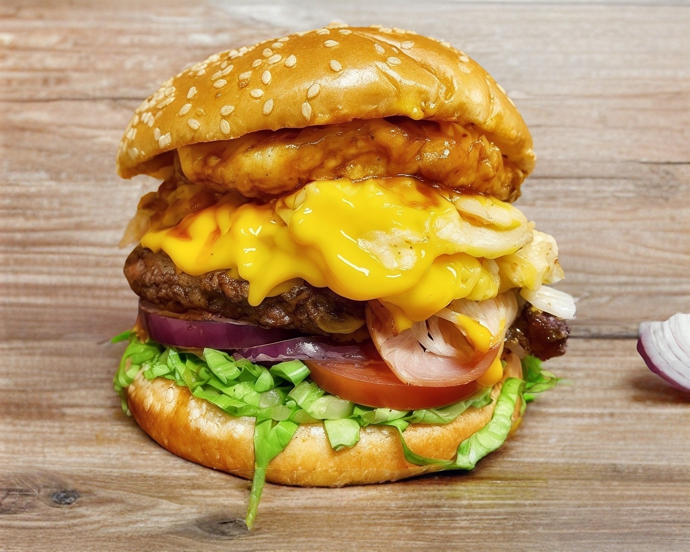Tocino, jamón, cebolla crispy, queso cheddar, queso manchego, lechuga, tomate, cebolla morada.