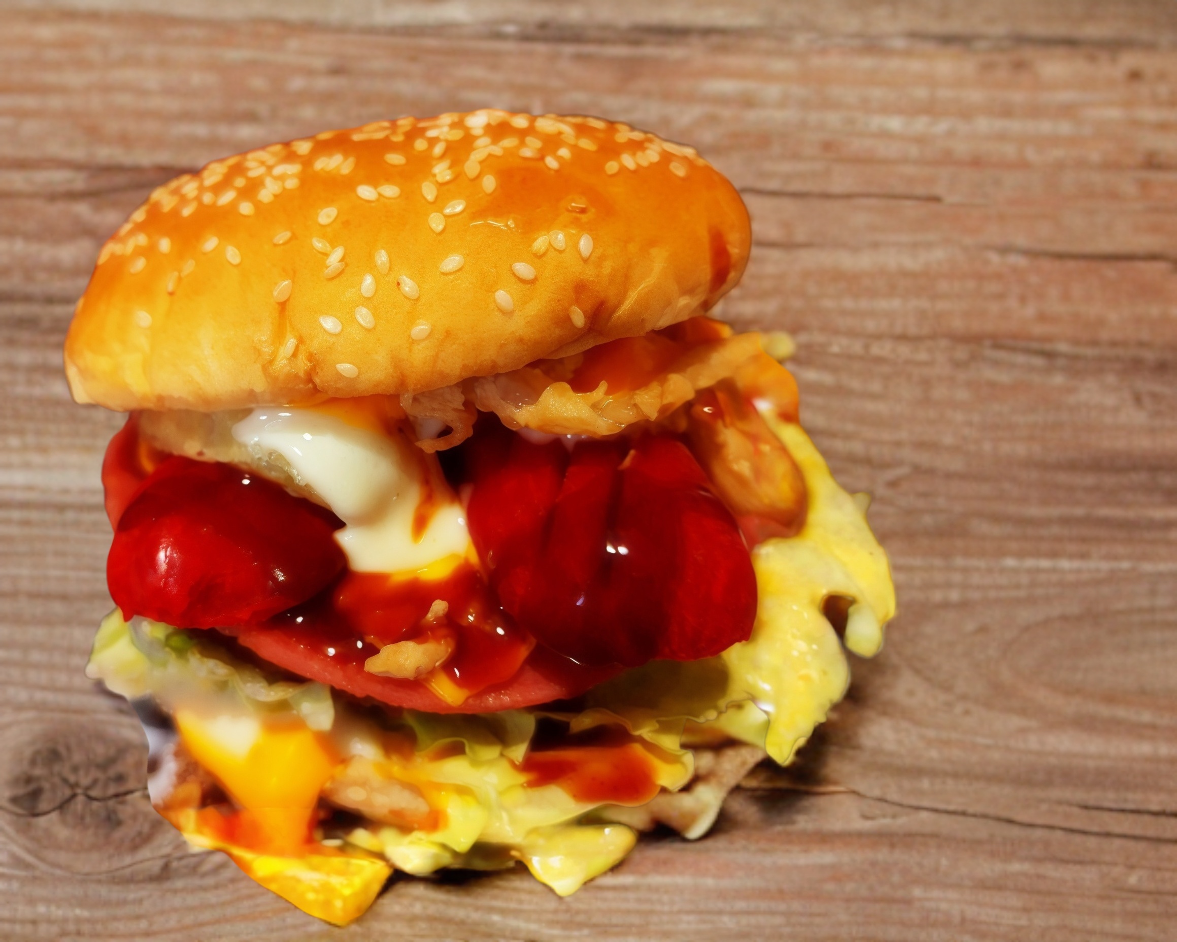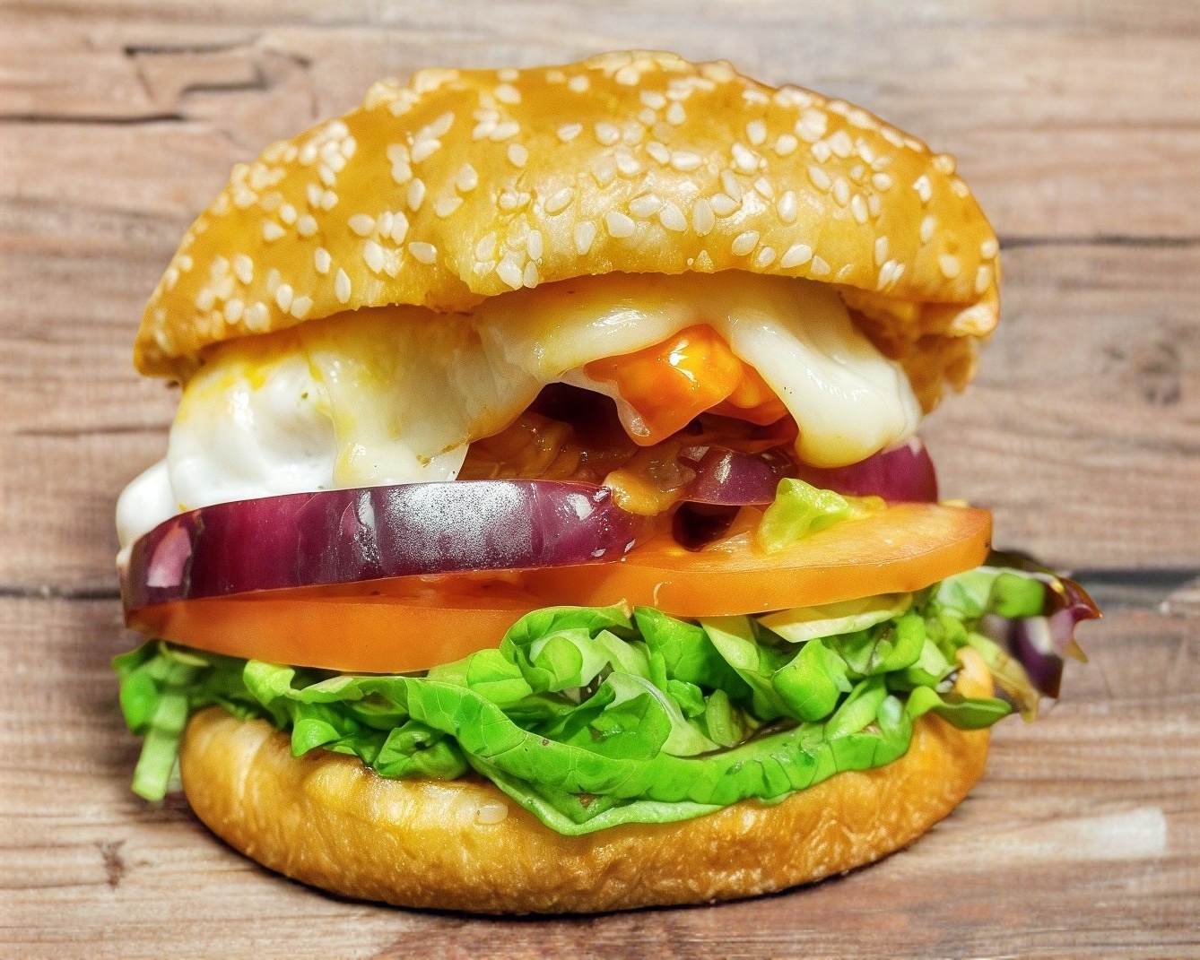 Tocino, jamón, dos quesos cheddar, Philadelphia, lechuga, tomate, cebolla caramelizada