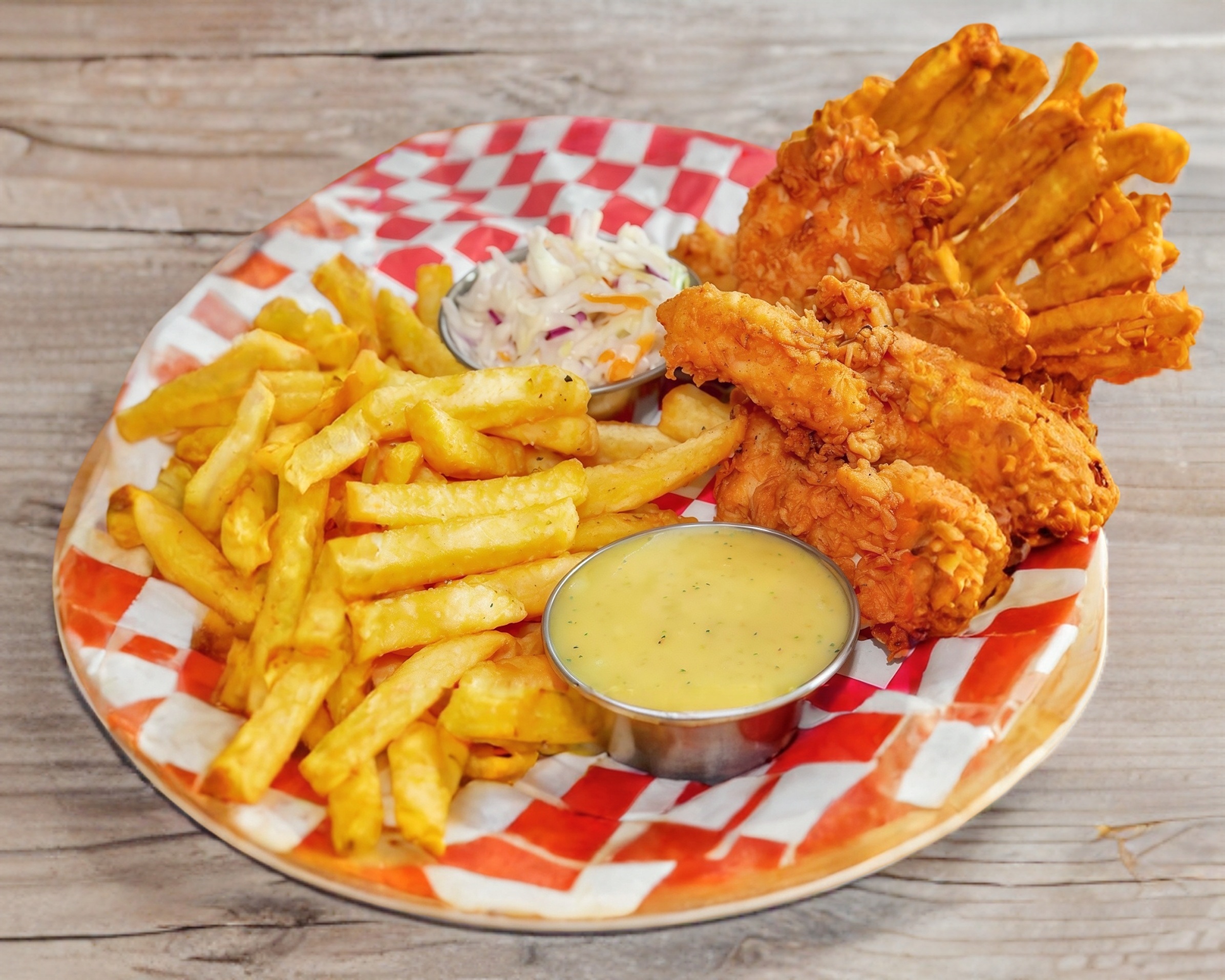 7 dedos de pollo crujientes papas fritas y aderezos