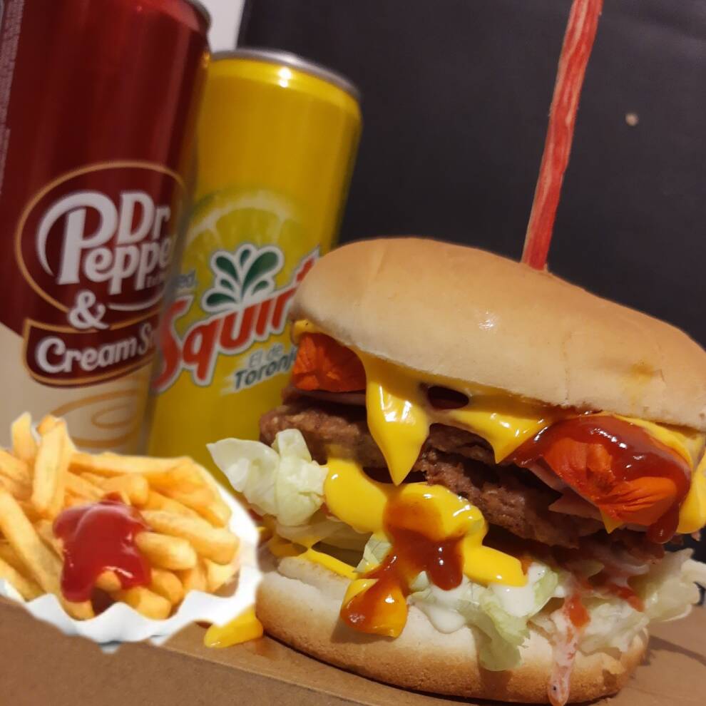 hamburguesa con cebolla caremelizadalechugajamon winnie,special,papas,frita,mas,refresco