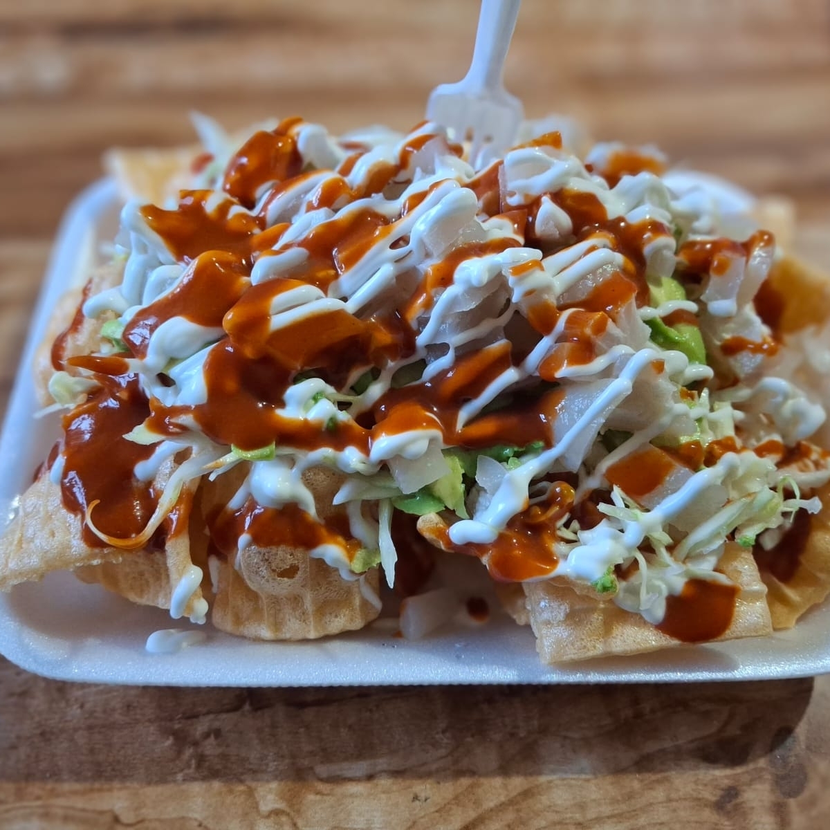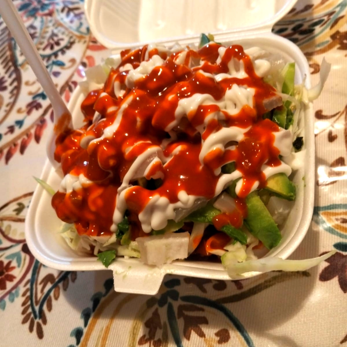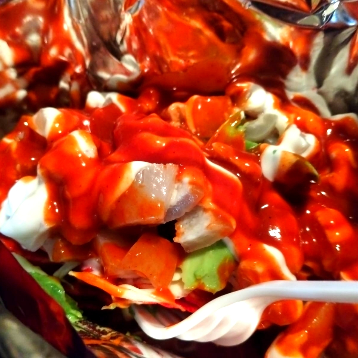 Crema, salsa, repollo, aguacate y cueritos.