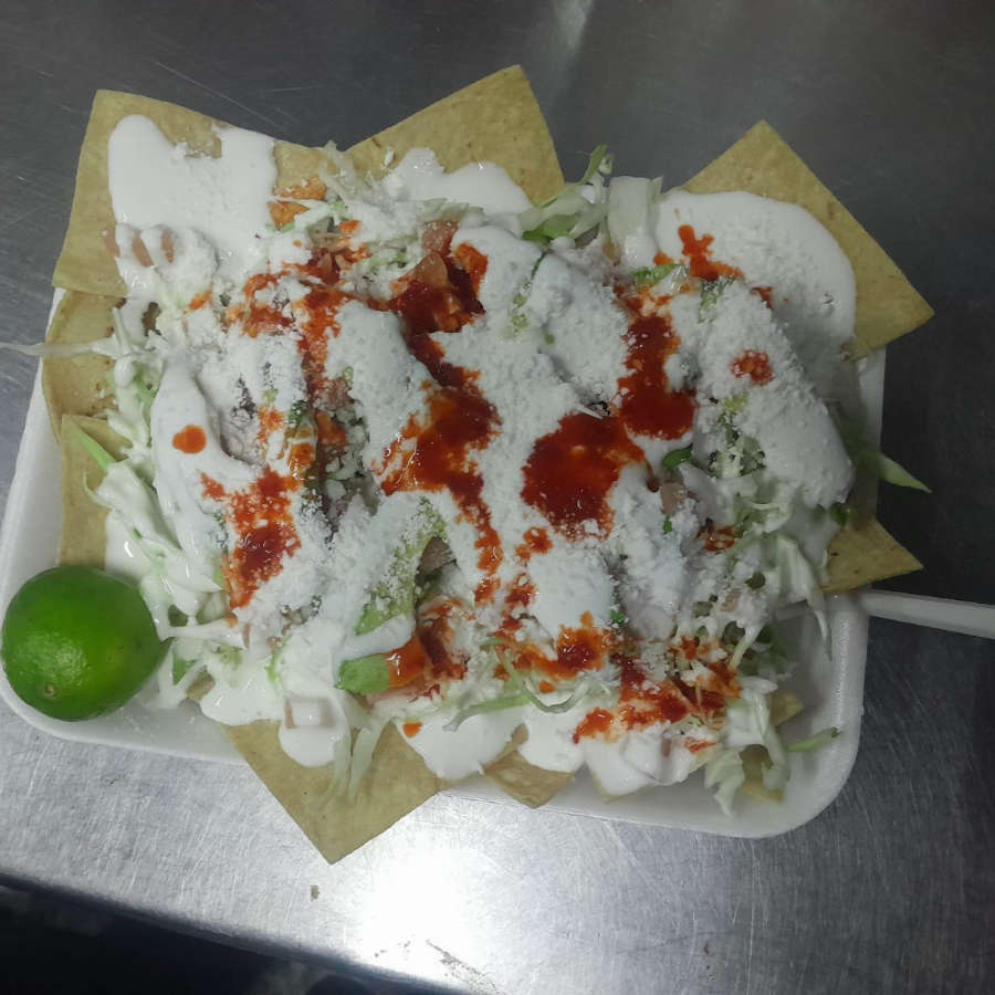Totopos.repollo.cueritos.aguacate.tomate.queso.crema .salsa.limon