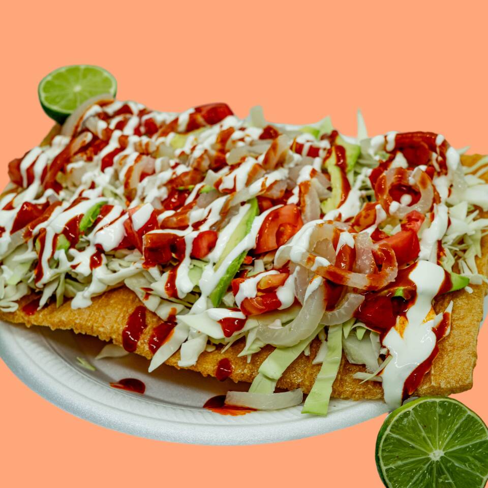 Repollo, cueritos, aguacate, crema, valentina, limón