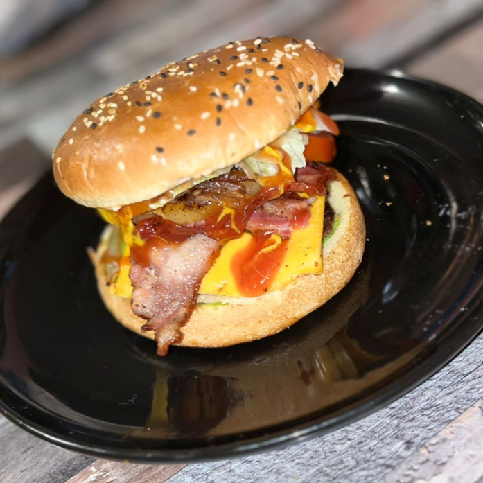 carne preparada artesanalmente , tocino, jamon , salchicha, pepinillo, lechuca, tomate, aguacate, cebolla caramelizada, papas fritas .