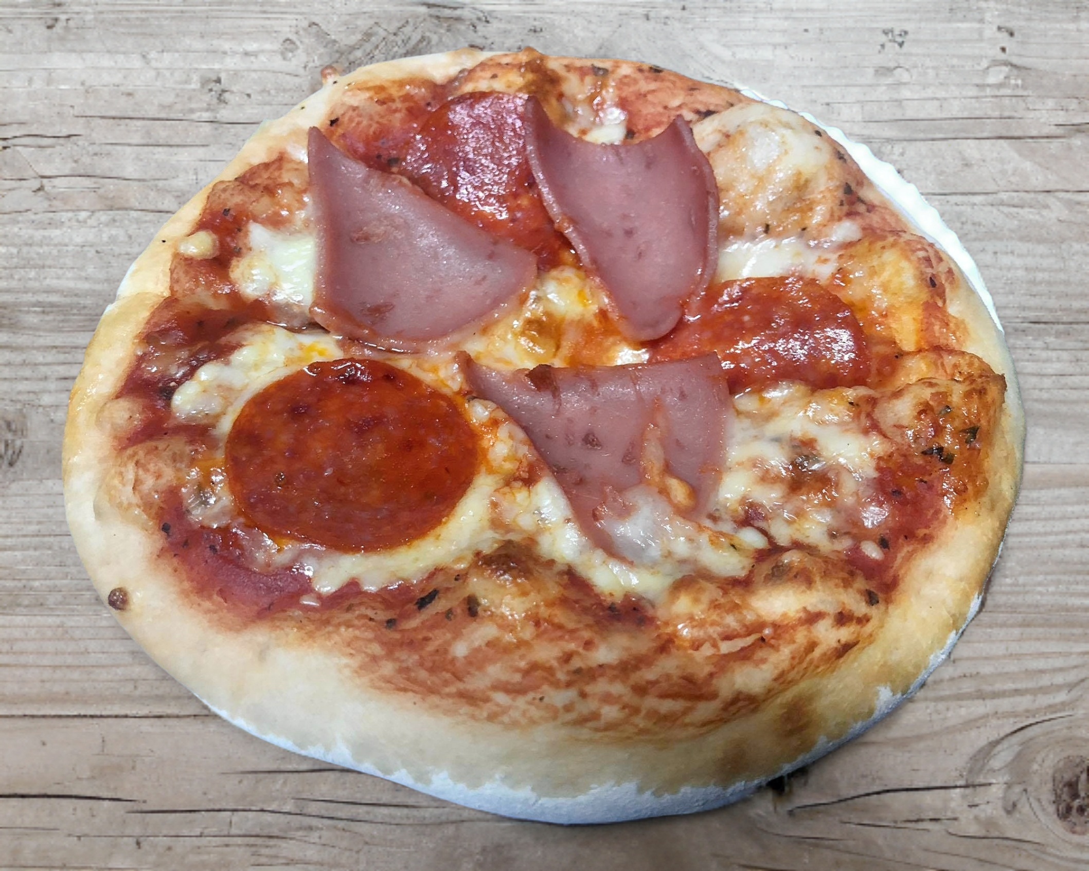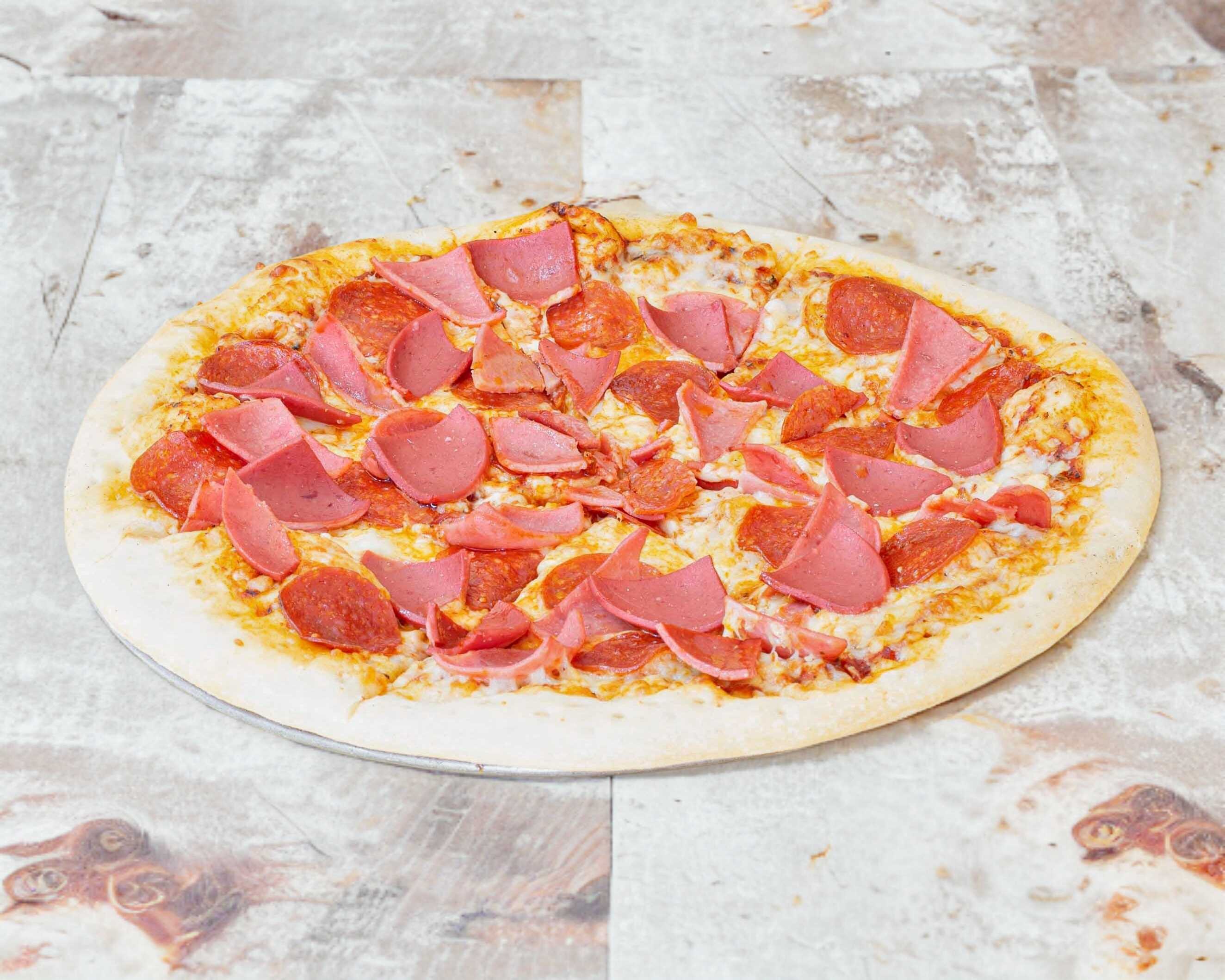 Deliciosa pizza grande de tres carnes pepperoni, jamón y salami.