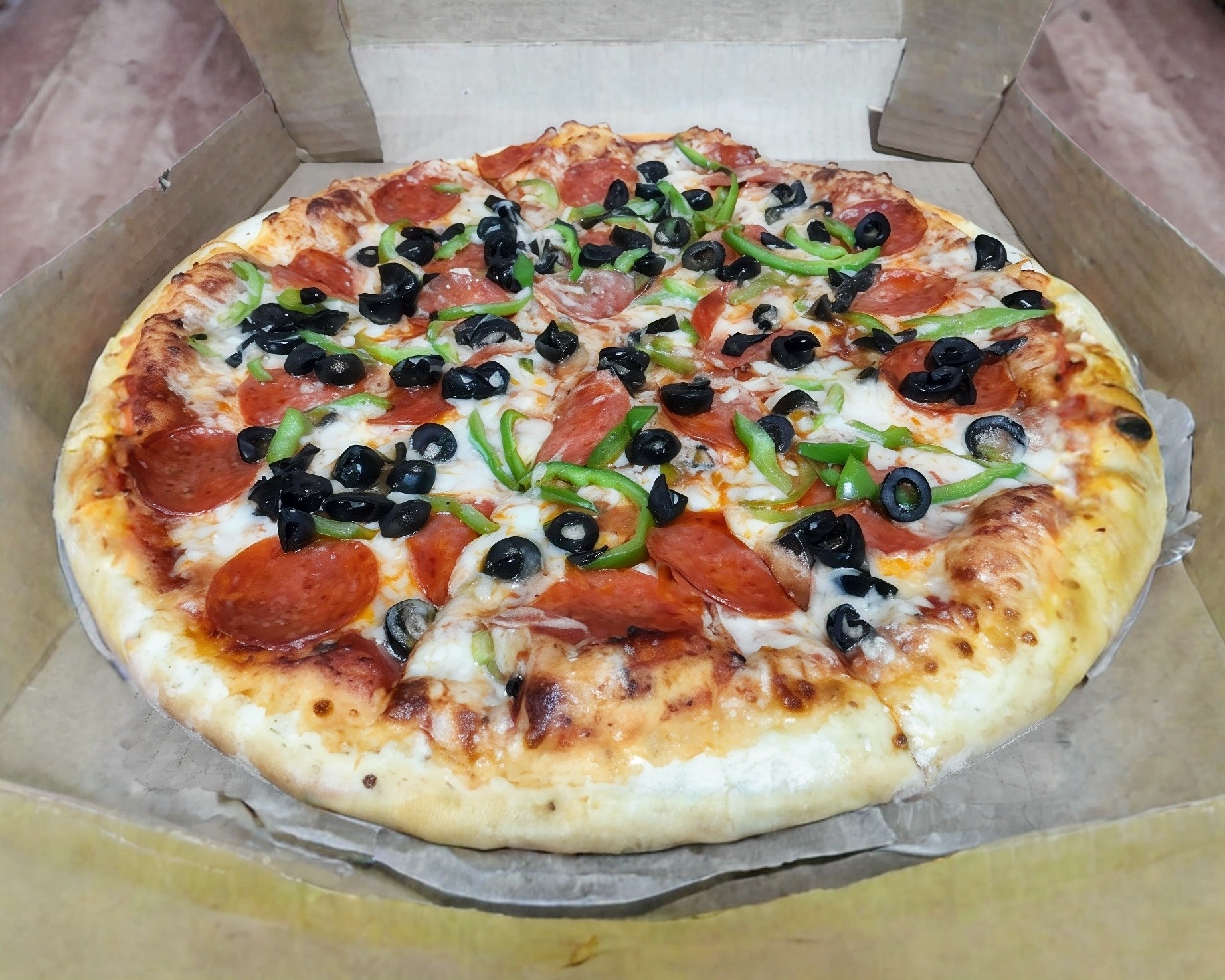 Deliciosa pizza de 14" con champiñones, aceitunas negras, pimiento morrón, cebolla morada y jalapeños.