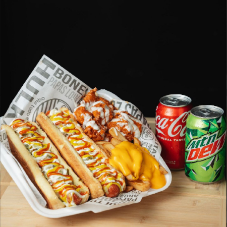 2 hot dogs 100% carne de res, 100 grs. de papas con queso, 6 piezas de boneless en la salsa de su eleccion bañados en ranch y dos refrescos.