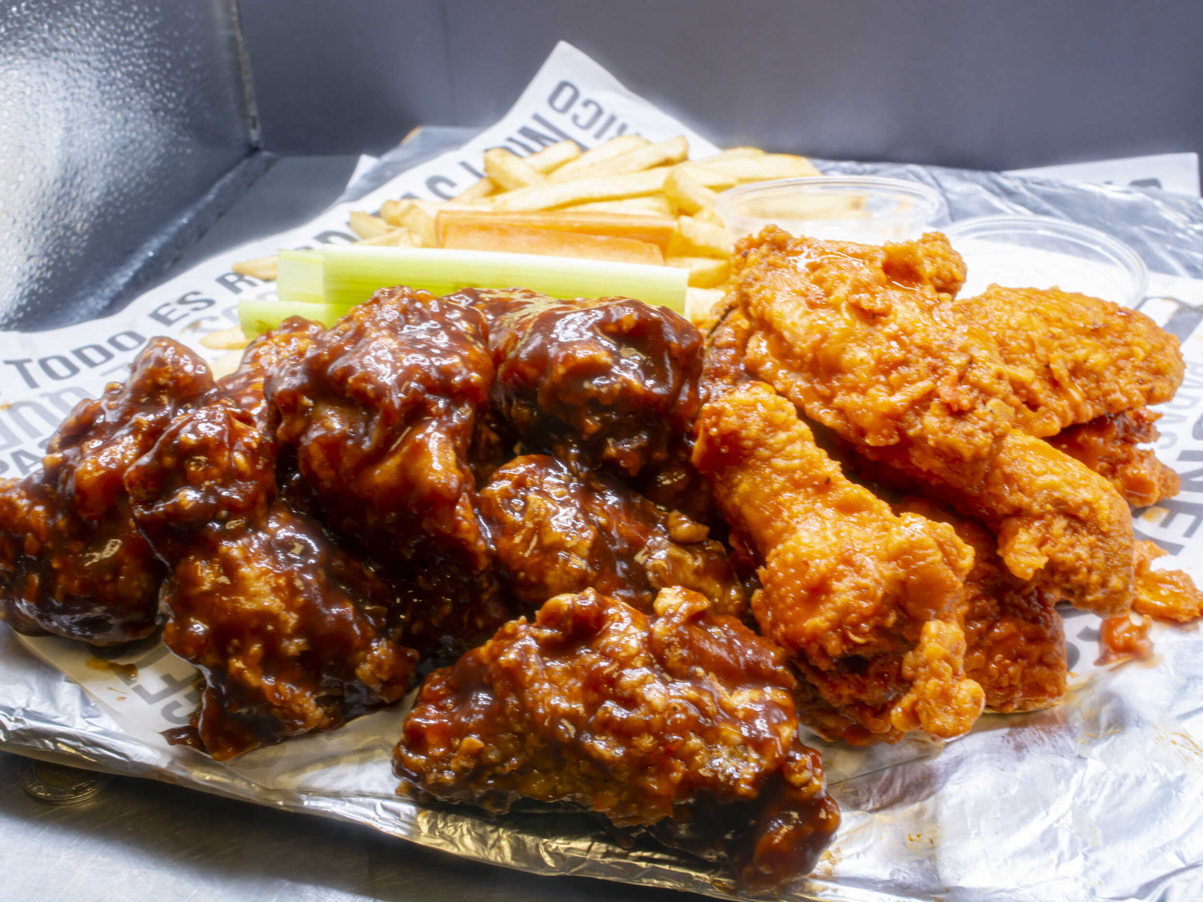 150 gr de boneless en la salsa de tu preferencia, 100 gr de papas, ranch, catsup, y una soda de lata.