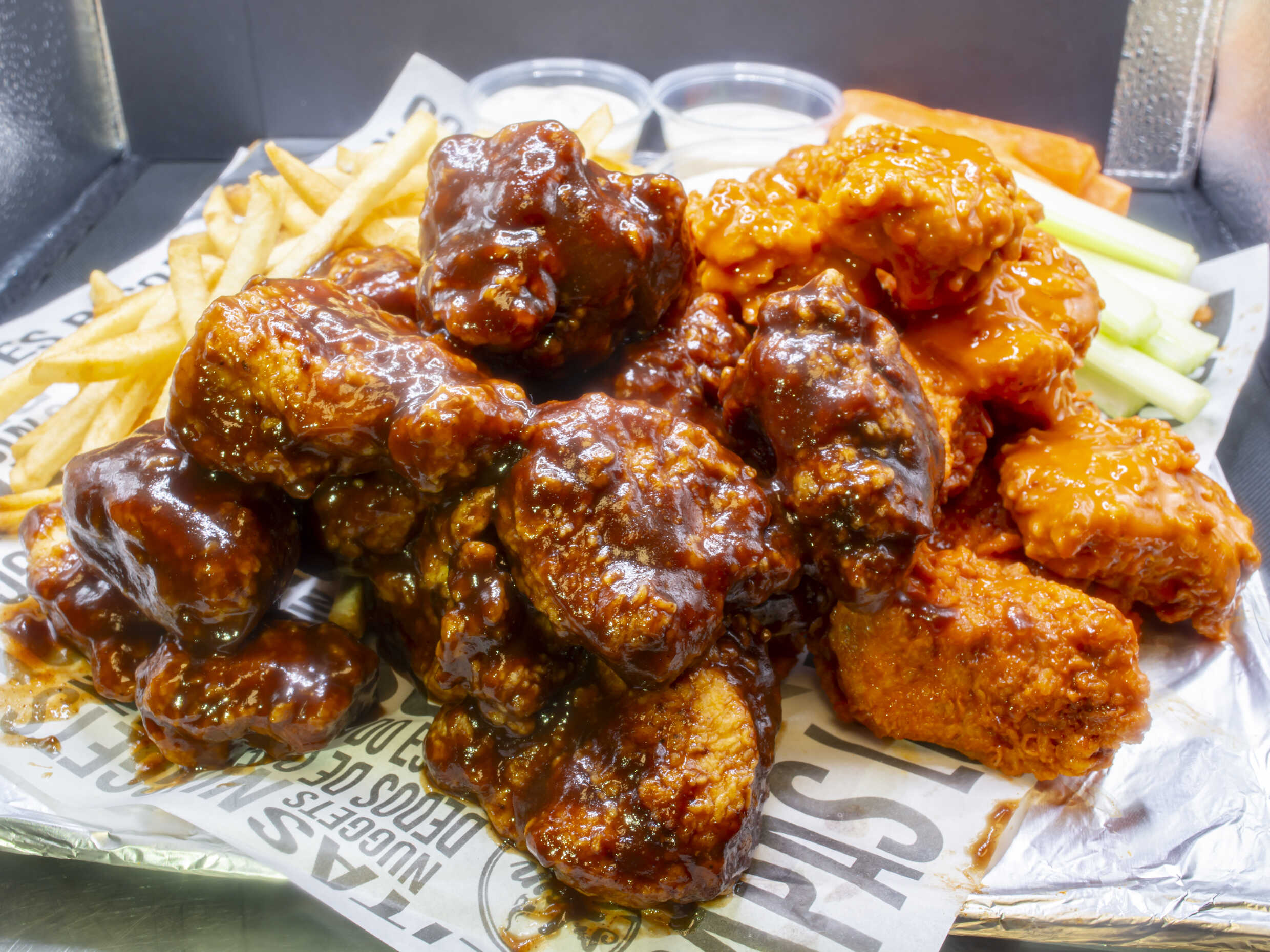 1 kg de boneless en tres salsas a elegir, y una charola de papas